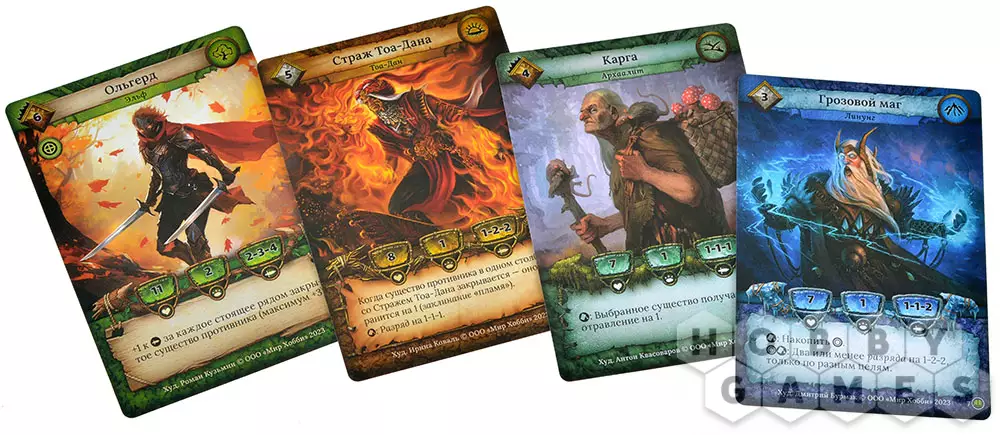 После того, как все выложили и раскрыли часть карт, начинается основной этап: вы можете перемещать существ по полю, размер которого составляет 6 рядов по 5 карт, атаковать героев противника и использовать особые способности.