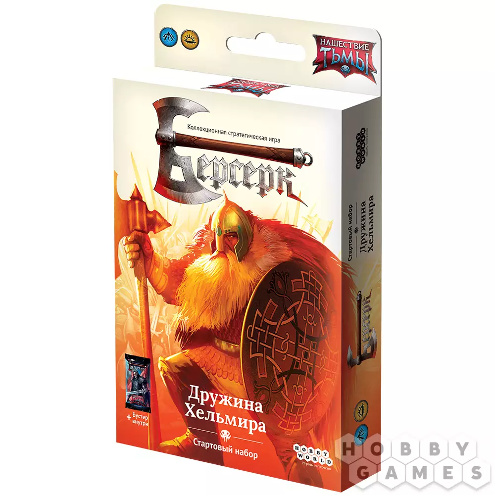 Стартовый набор содержит всё необходимое, чтобы быстро войти в игру, будь вы фанатом классики или новичком в мире "Берсерка"! Внутри вы найдёте готовую колоду "Дружина Хельмира" из 30 карт и бустер с 12 картами: более чем достаточно, чтобы вступить в бой полностью подготовленным! Обратите внимание, что этот набор расчитан на одного игрока. Для игры вдвоём вам потребуется два таких набора.
