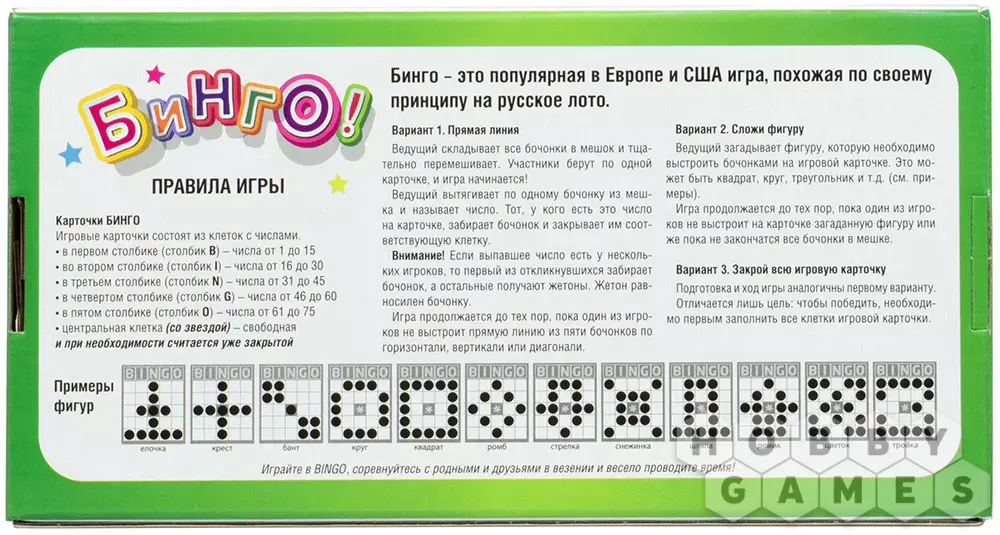 Настольная игра "Бинго" – это американская версия лото, популярная не только в США, но и в Европейских странах. Карточки для игры в "Бинго" состоят из пяти столбцов, каждый из которых включает в себя по 15 чисел в порядке возрастания вплоть до 75. Все столбцы обозначены буквами, они складываются в название игры на английском языке – "Bingo". Из мешочка ведущий достаёт один бочонок и озвучивает его число. Игрок, у которого на карточке есть данное число, берёт бочонок и ставит на соответствующую клетку. Игра длится, пока один из участников не выполнит условия победы.