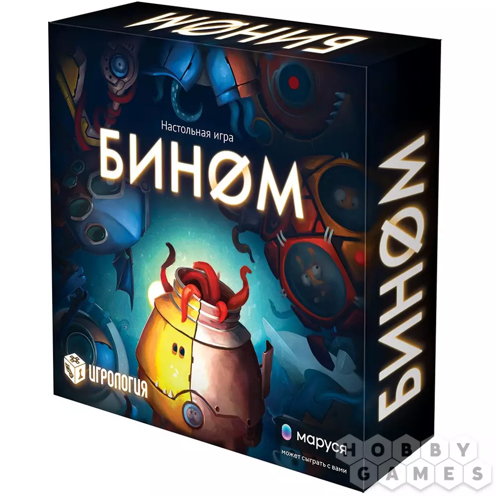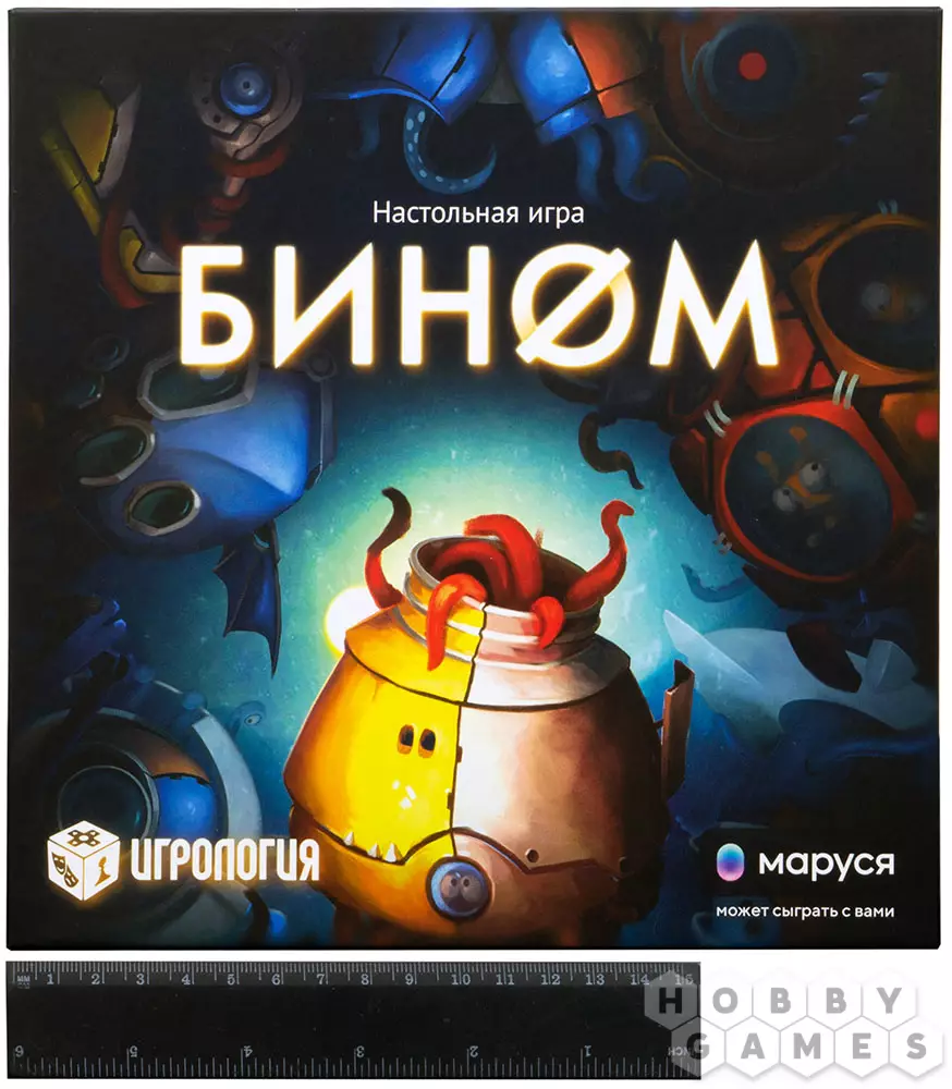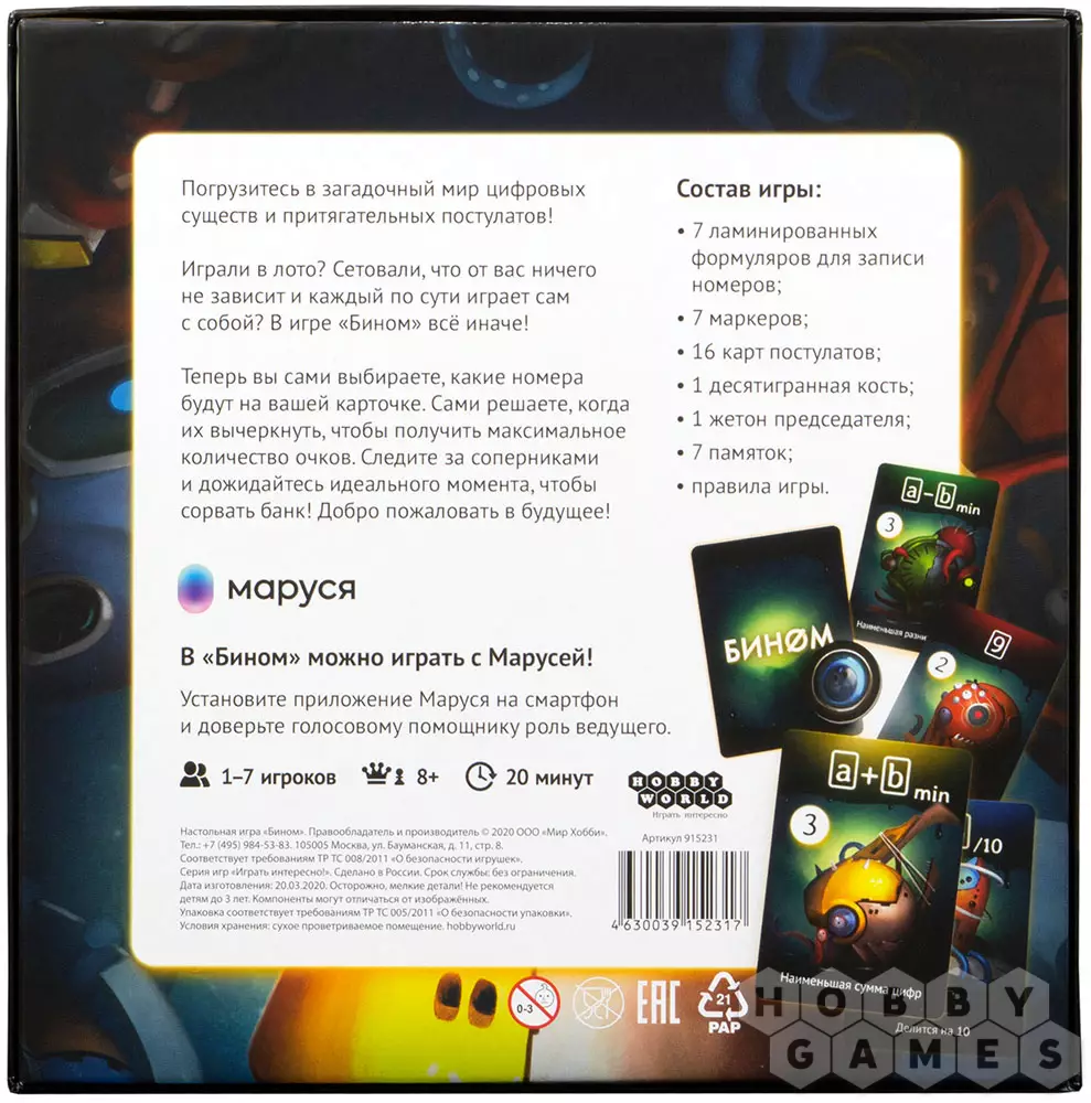 "Бином" – семейная настольная игра для большой компании до семи человек. При этом правила также предлагают вариант одиночной игры, а чтобы было с кем поговорить, на помощь придёт голосовой помощник Маруся, которая выберет цифры для номеров на вашей карточке, а также озвучит вслух карты постулатов, но обо всём по порядку. Ну что, Маруся, сыграем в "Бином"?