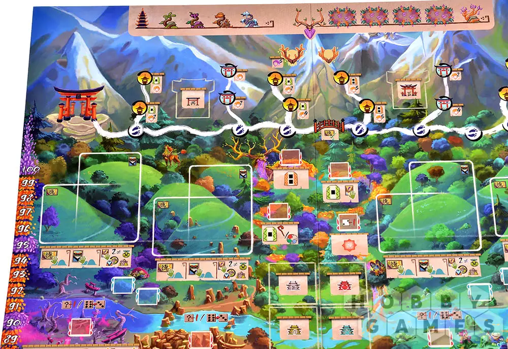 Пересечь реку: если на начало фазы лета у вас уже есть кубики ёкаев на поле, им можно пересечь реку и попасть на холмы Хикару – переместите кубик на свободную ячейку соответствующей игровой области и понизьте значение кубика на единицу. Если значение кубика до пересечения реки уже было 1, то этим кубиком нельзя выполнить это действие. Попав на холмы Хикару вы получаете благодарность Леса и можете получить один из бонусов, указанных на поле