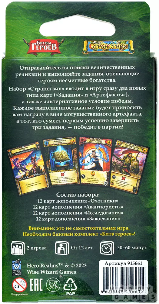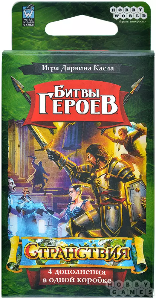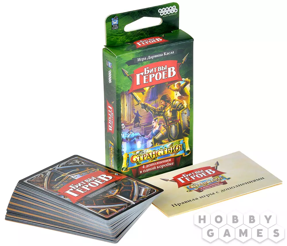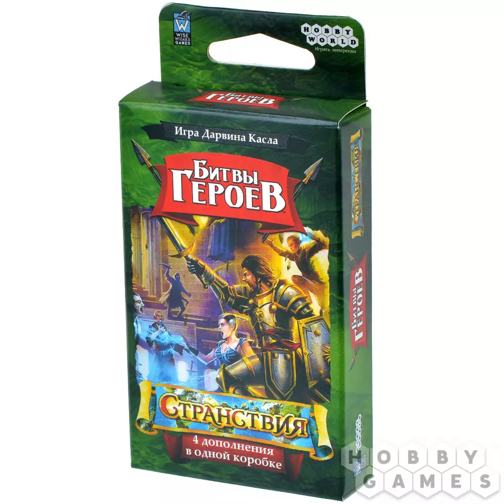 "Битвы героев: Странствия" включает в себя четыре мини-дополнения: наборы "Авантюристы" и "Охотники" содержат новые карты действий и защитников, а наборы "Завоевания" и "Исследования" добавляют 2 новых типа карт – задания и артефакты, – а также новое условие победы в игре! Перед началом партии раздайте каждому участнику 3 случайные карты задания, они хранятся в тайне от других игроков. Текст карты содержит определённое условие, удовлетворив которое, вы можете выполнить задание, но не больше одного в свой ход. В награду за выполнение вы получите карту артефакта, которая даст вам несомненное преимущество! А тот, кто первым выполнит все свои задания, становится победителем.