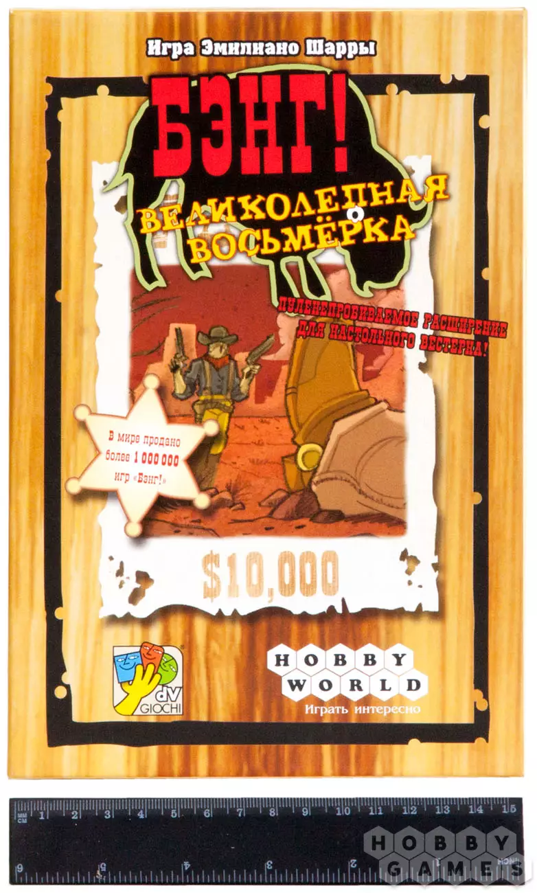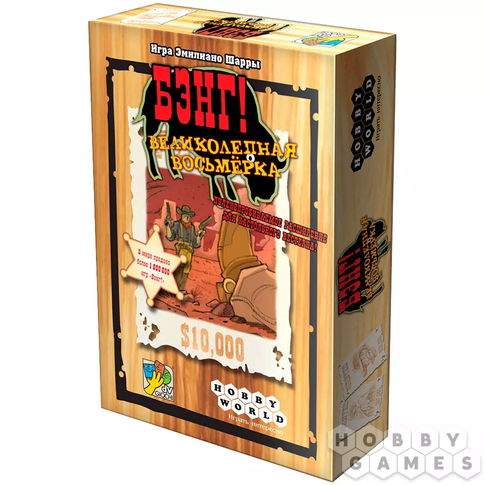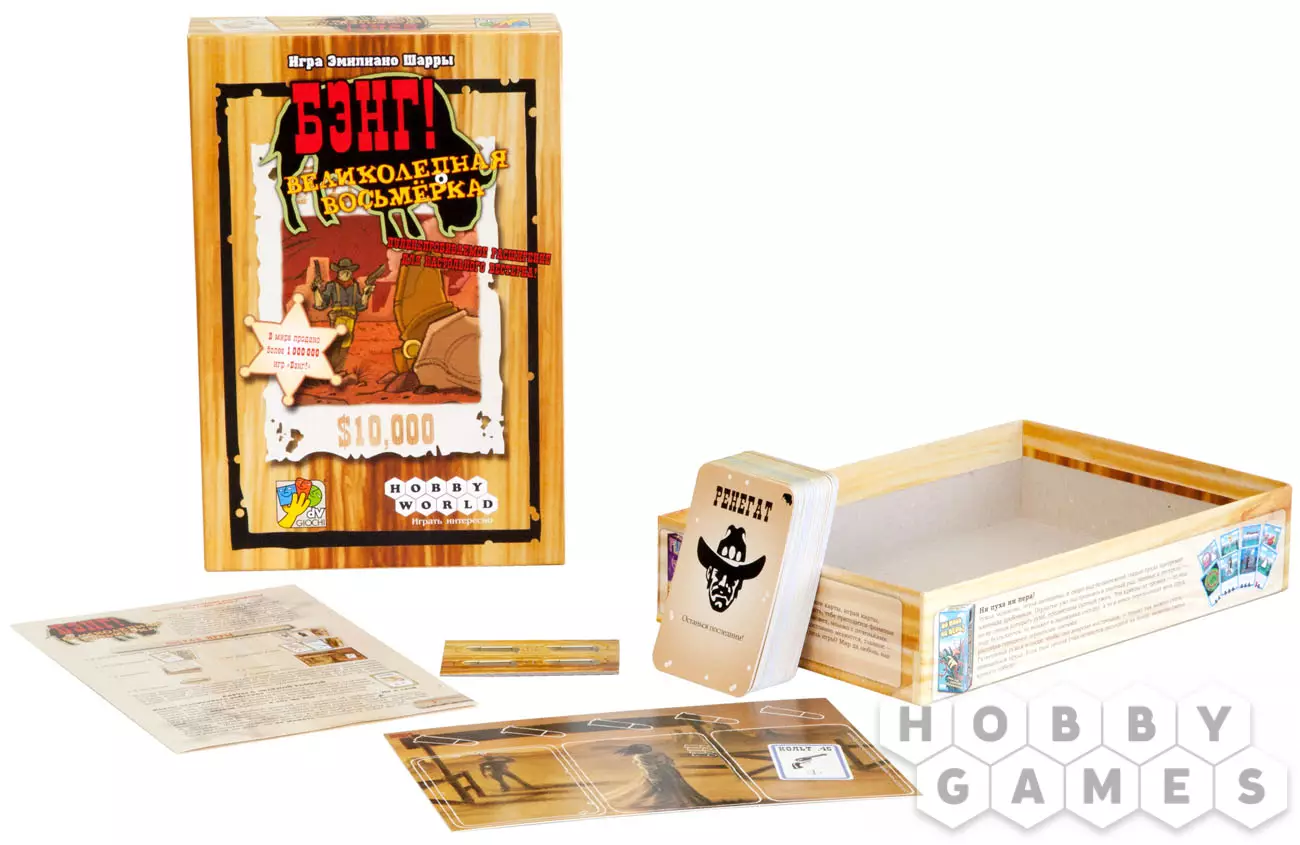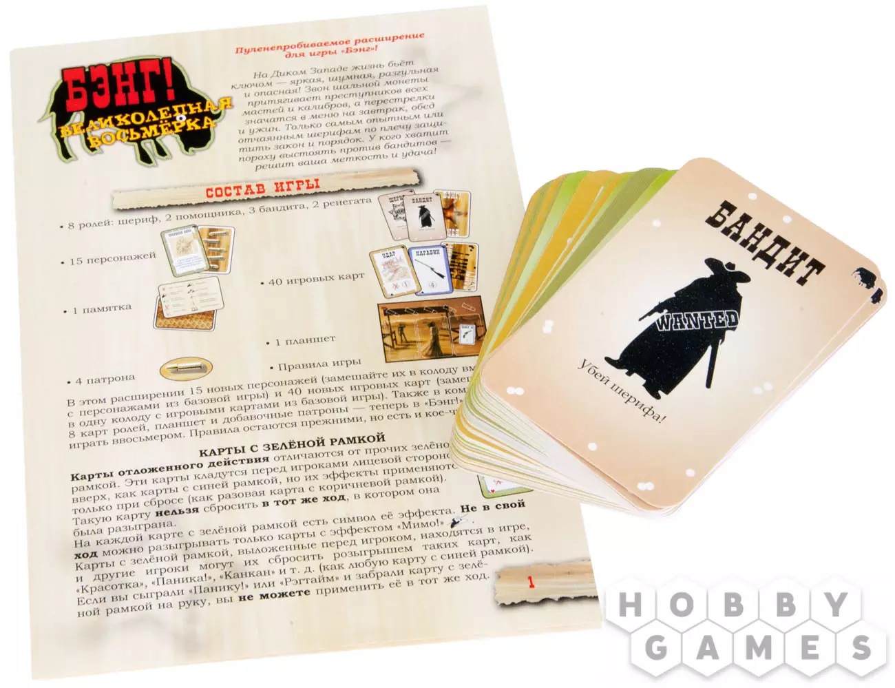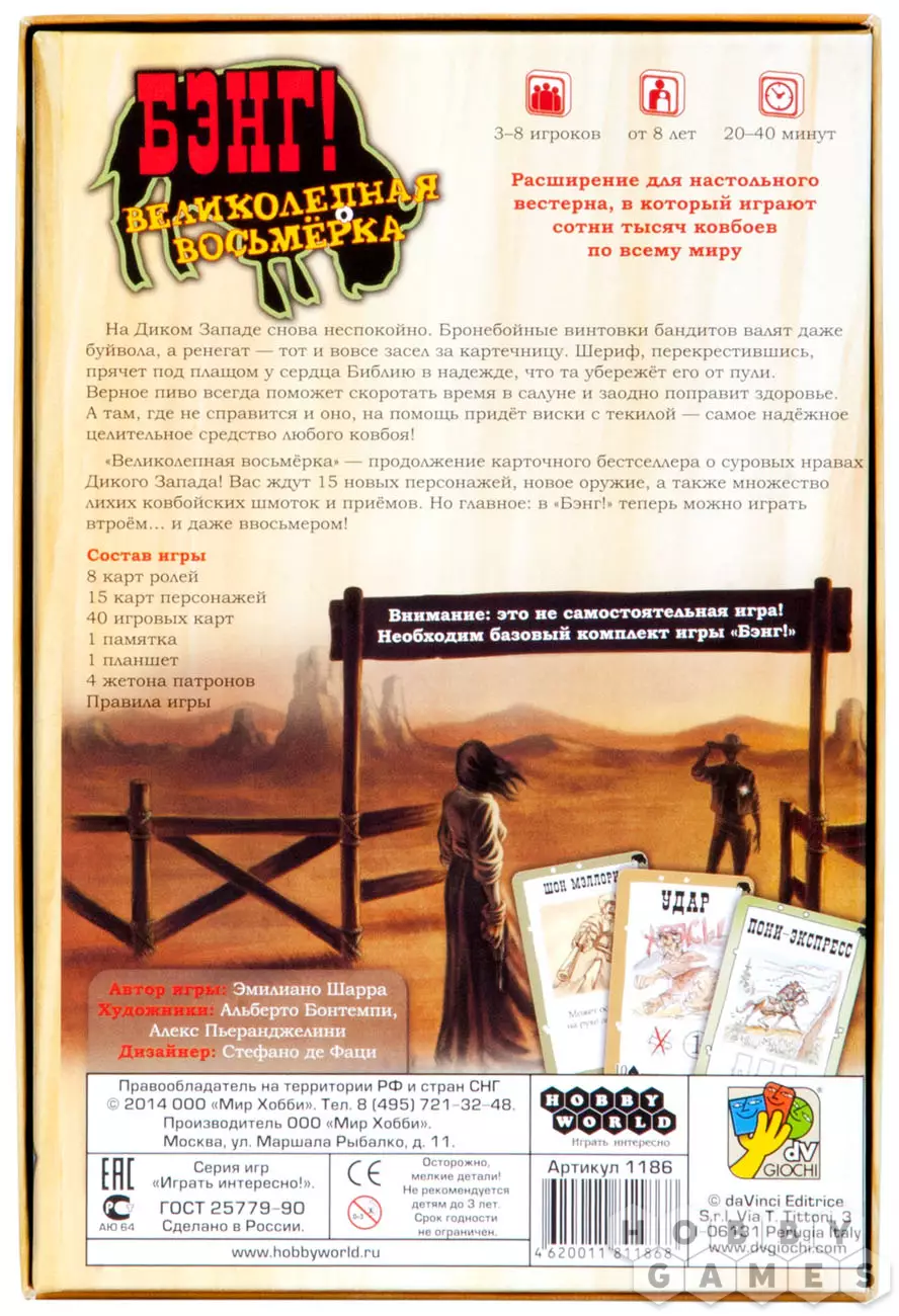 Великолепная Восьмерка не является самостоятельным дополнением, и для игры требуется базовый набор игры БЭНГ!