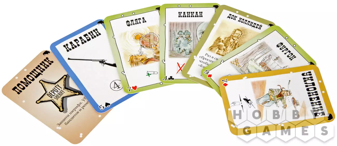 - у каждого игрока своя цель: помощнику нужно убить ренегата, ренегату — бандита, а бандиту — помощника, причём обязательно лично сделать фатальный выстрел по своему врагу. Иначе партия продолжится дуэлью с оставшимся в живых игроком. Хотя бонусные 3 карты за убийство вы получите, так что почему бы и не помочь?