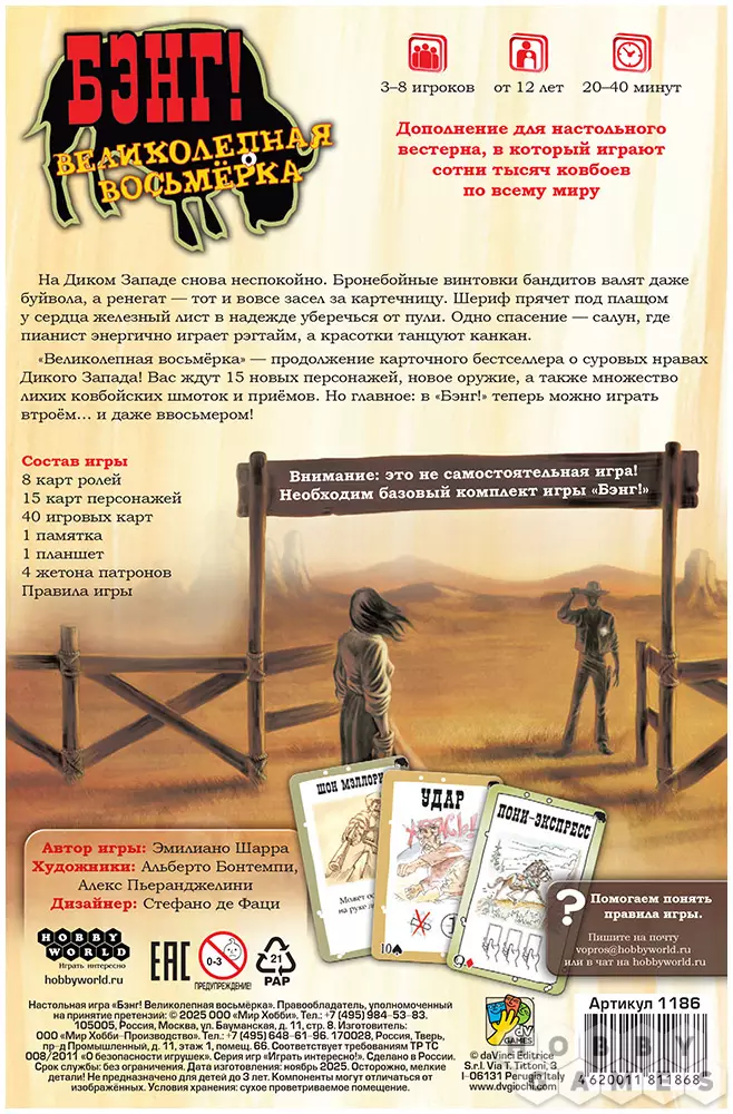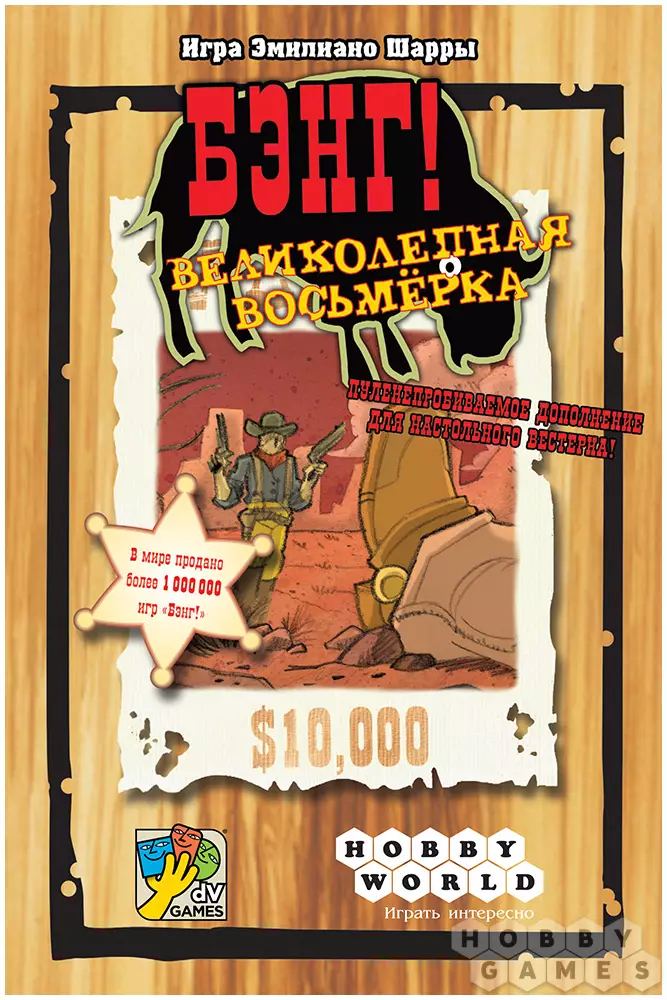 Великолепная Восьмерка не является самостоятельным дополнением, и для игры требуется базовый набор игры БЭНГ!