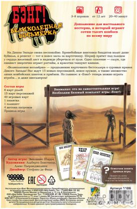 Перед вами большое расширение для игры «Бэнг!» — новые персонажи, дополнительные компоненты для игры ввосьмером, а также набор карт, который освежит вашу любимую игру и придаст ей новую остроту.