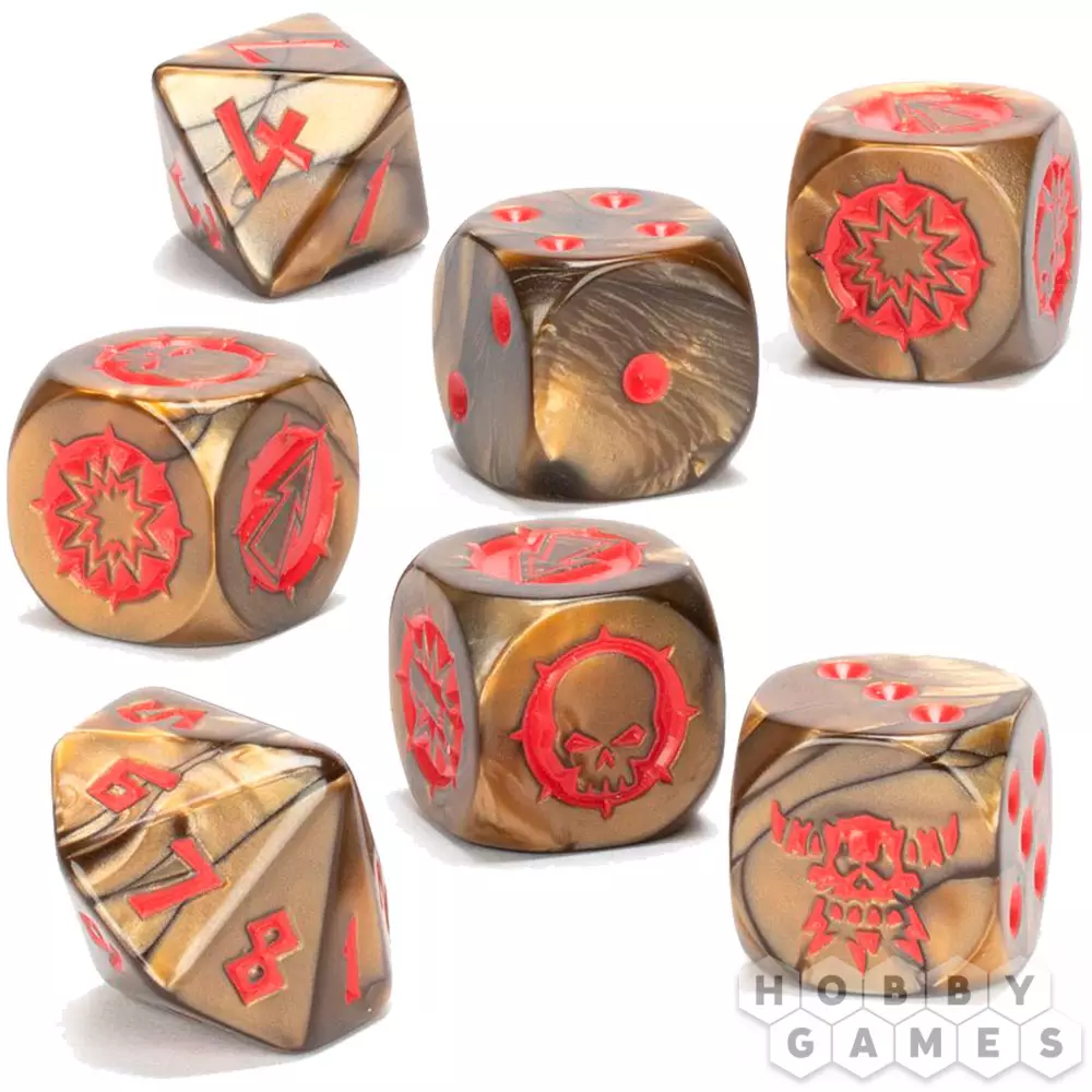 Состоит из 7 кубиков коричнево золотых тонов с красными символами и знаками Дварфов Хаоса: 3 кубика блока, 2 шестигранных, 1 восьмигранный и 1 шестнадцатигранный.