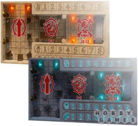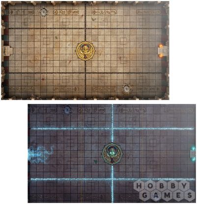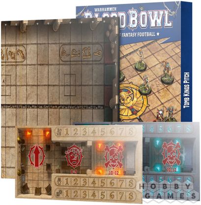 В набор входит двустороннее складное игровое поле из плотного картона, изображающее домашнюю арену команды Tomb Kings. На одной стороне – величественный стадион перед матчем в полном великолепии, на другой – разрушенное поле, испещрённое трещинами и следами прошлых сражений, отражающее хаос игры и разрушительную мощь Tomb Kings.