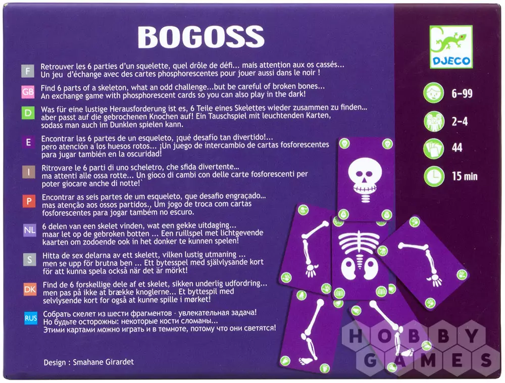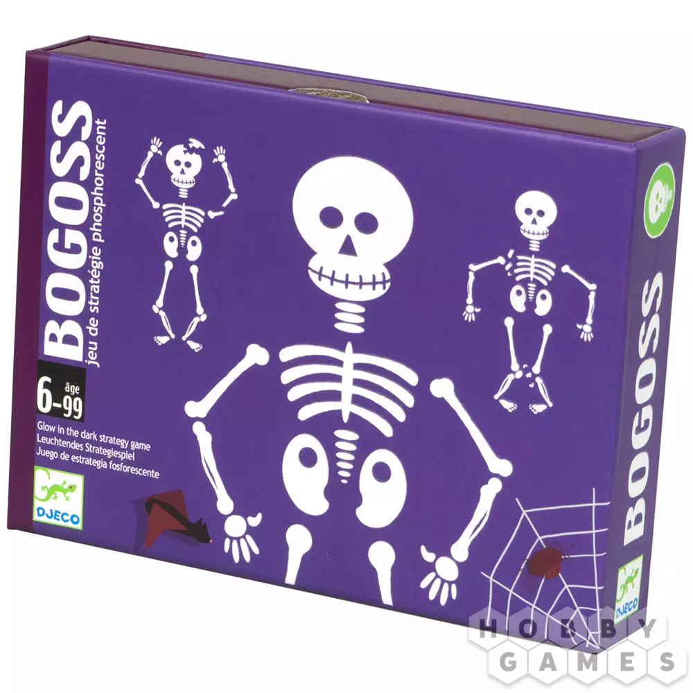 Карточная детская игра Bogoss посвящена сборке по частям весёлых скелетиков. В игровом наборе три вида карт: части скелета, части сломанного скелета и карты "джокер". Детям предстоит научиться взаимовыручке, ведь добывать нужные части для скелета предстоит, прося их у других игроков. Побеждает в игре тот, кто первым собирает два "не сломанных" скелета или один "сломанный" скелет. Чтобы сделать игровой процесс более захватывающим и незабываемым, перед игрой разложите карты в освещенном месте, а во время игры – потушите свет. Карты будут светиться!
