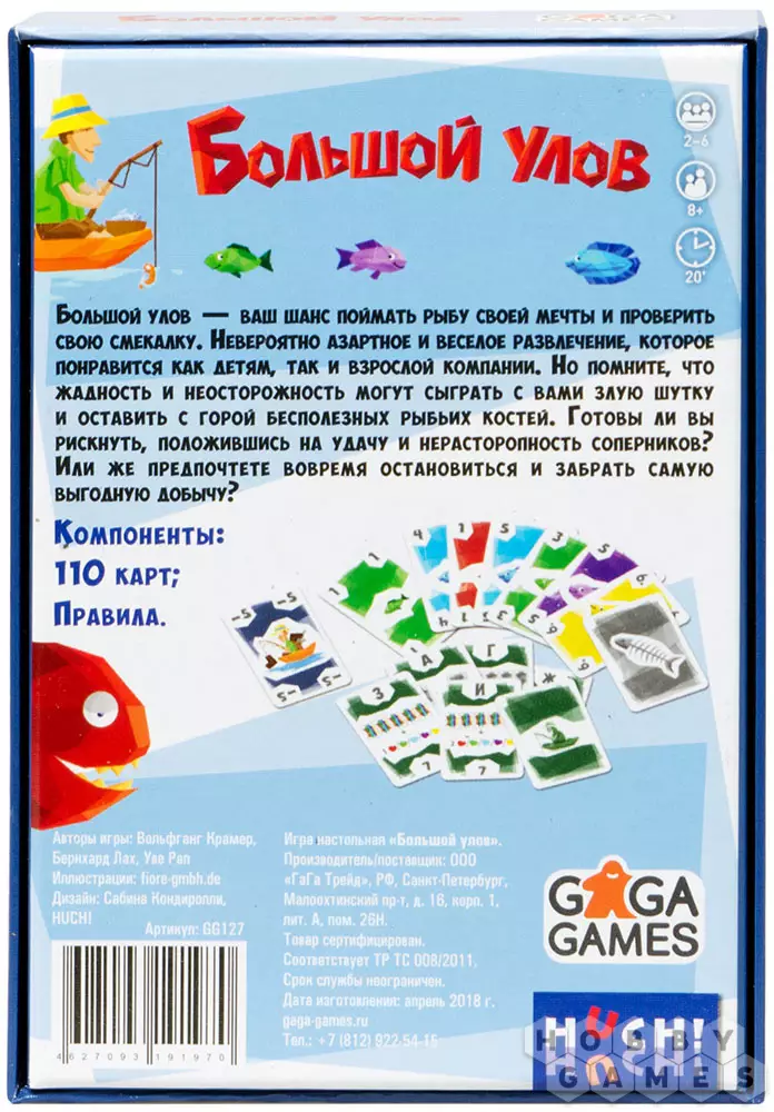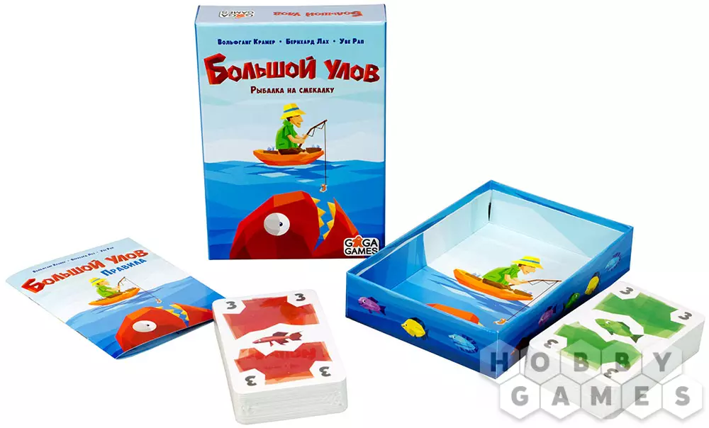 Перед вами невероятно весёлая и увлекательная игра, которая непременно понравится всей вашей семье от мала до велика. Стать рыболовом ещё никогда не было так просто! Совсем необязательно планировать масштабный выезд на природу, к водоёму, запасаться провизией и рыболовными снастями, сидеть часами в ожидании поклёвки, отбиваясь от назойливых комаров. Просто соберите компанию за игровым столом, открывайте коробку с "Большим уловом" и дерзайте получить самую выгодную добычу!