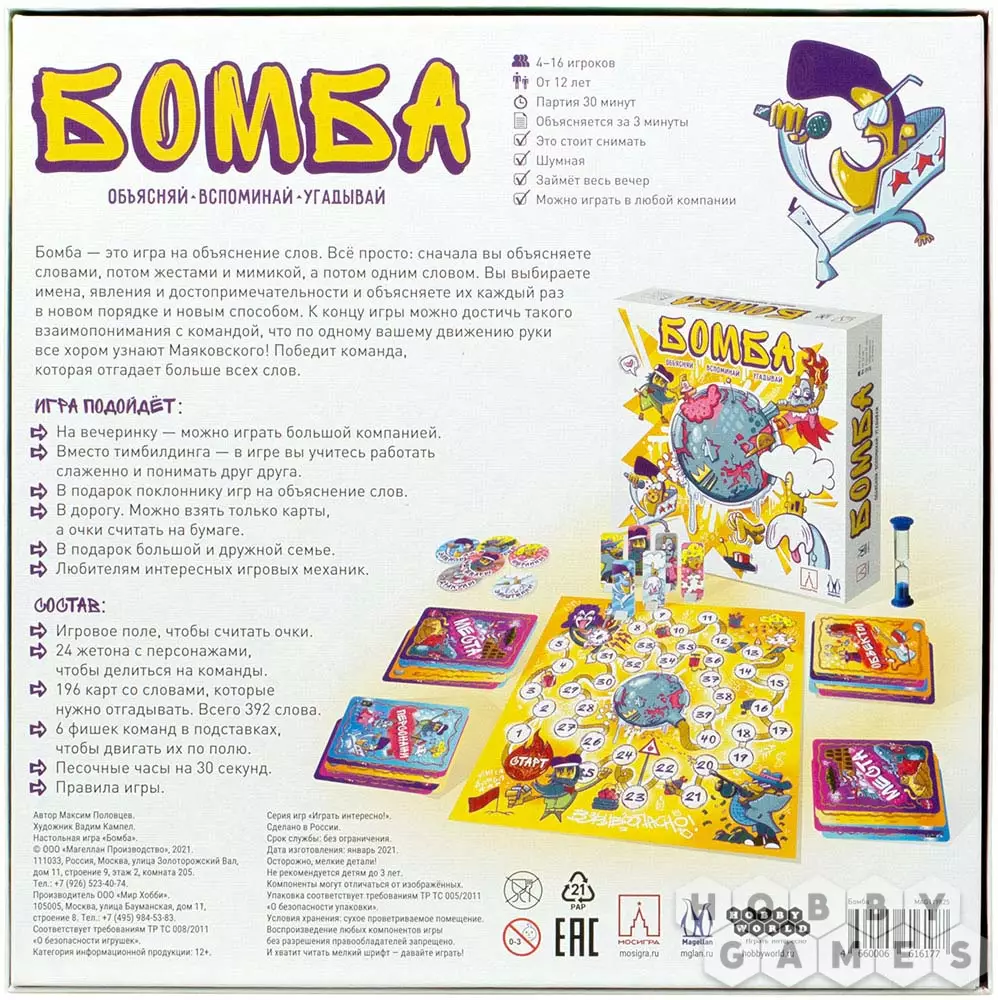 Безымянный комментатор22.05.2022 20:25Описание. Игра за объяснение слов своей команде: сначала словесно, затем действиями, а в последнем раунде строго одним словом. Раньше была игра в кубической коробке, называлась "Бум", там надо было объяснять известных людей (сейчас эту игру в продаже не найти, к сожалению). В игре "Бомба" не только персонажи/знаменитости, но и достопримечательности и обычные слова. Ощущения от игры. Было очень весело! Идеальный пати-гейм, правила очень просты, на столе места почти не требуется, можно играть в любой компании, даже в незнакомой.