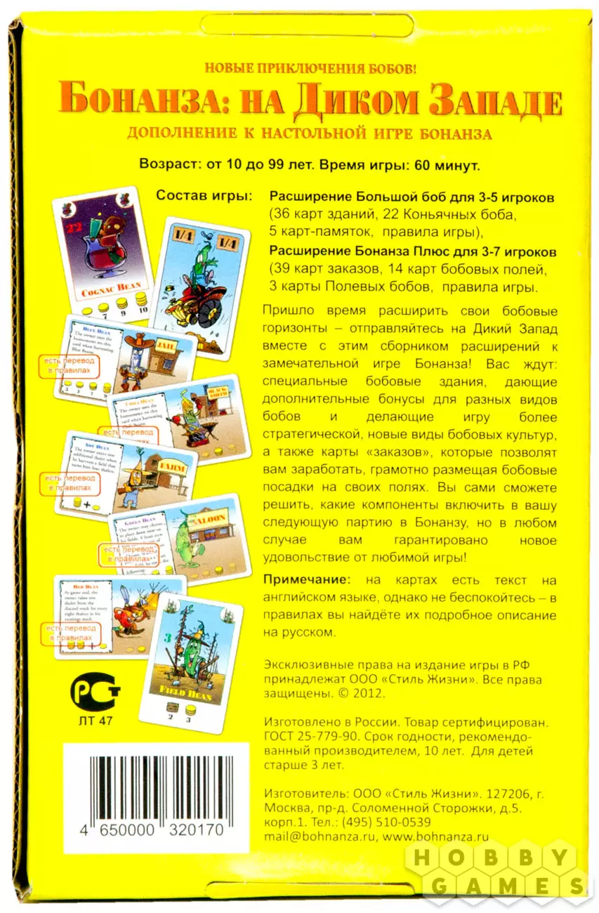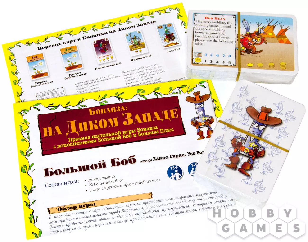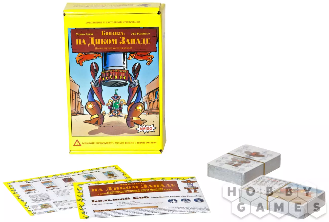 Набор "Бонанза: на Диком Западе" включает в себя два больших дополнения для игры "Бонанза": "Бонанза плюс" и "Большой Боб". Каждое из этих расширений привносит в основную версию игры немалое количество изменений. Впрочем, обо всём по порядку.
