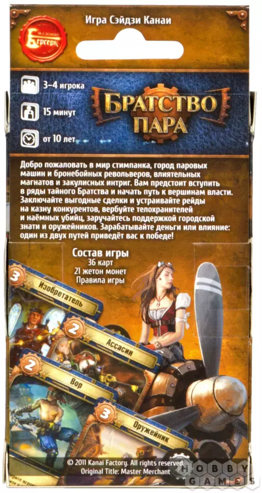 Настольная игра «Братство Пара» переносит вас в эту атмосферу стимпанка. В Феррайне вам предстоит пройти путь с самых низов общества до вершин власти и занять достойное место среди элиты общества. В самом начале пути вы ограничены в выборе действий. Для начала стоит установить контакты с влиятельными магнатами, промышленниками и наёмниками. Каждый персонаж обладает различными свойствами, которые пригодятся в той или иной ситуации: некоторые смогут ограбить ваших конкурентов, другие защитят от этого вас, а третьи принесут больше прибыли. Чем больше связей, тем больше возможностей, но такая гибкость не всегда хороша. Вам предстоит выработать точную и эффективную стратегию на игру, чтобы победить.