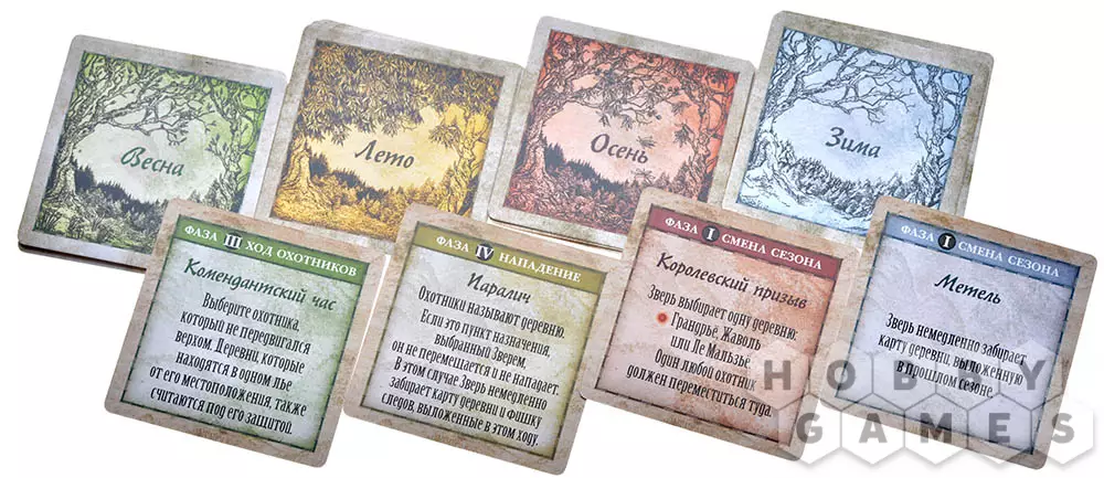 Игра начинается весной – это отмечается картами сезона в соответствующей зоне игрового поля. В фазу смены сезона охотники открывают новую карту сезона и разыгрывают её эффект. В эту же фазу в любую деревню можно разместить фишку подкрепления, которая будет помогать в процессе поимки Зверя.