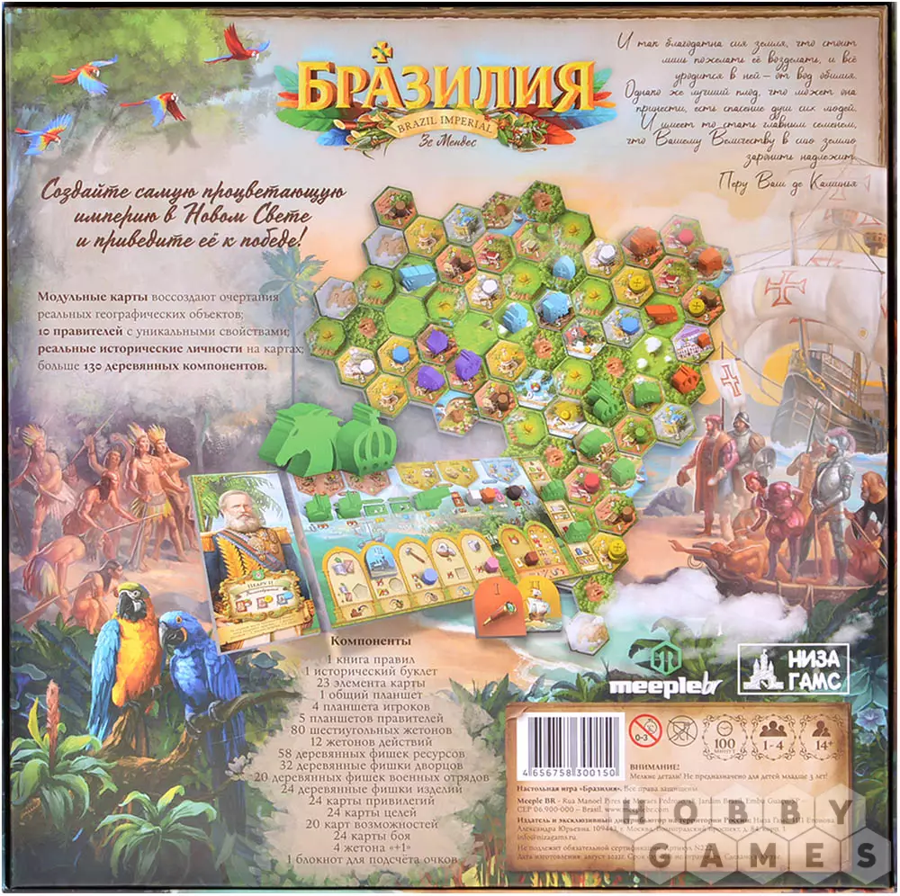 "Бразилия" – комплексная настольная стратегия, совмещающая характеристики евро-игр и жанра 4Х, к которому принадлежит легендарная компьютерная "Цивилизация". Практически каждый аспект игры отсылает к личностям, явлениям и событиям из бразильской истории, а потому среди игровых персонажей вы найдёте основателя Бразильской империи Педру I, португальского короля Мануэла I и даже таких легендарных деятелей, как королева Виктория и Наполеон Бонапарт. Каждая партия – это практически экскурс в историю: создатели даже включили в состав объёмную историческую справку, из которой вы узнаете обо всех личностях, упомянутых в игре.