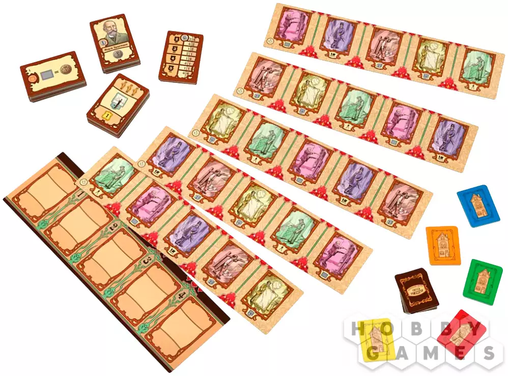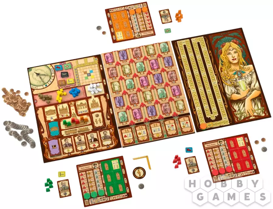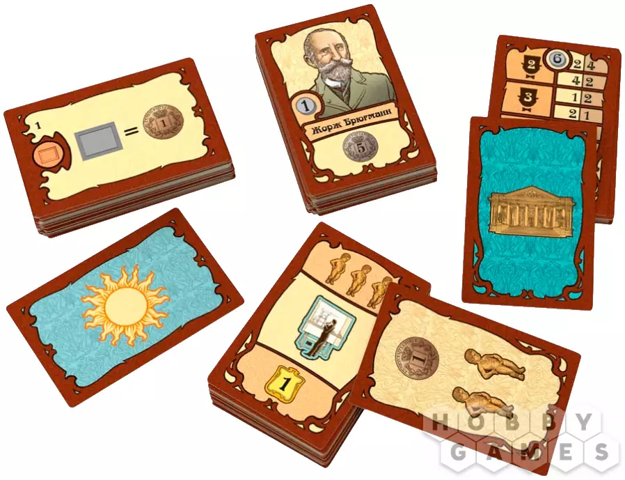 В коробке вы найдёте две части: базовую версию и дополнение "Прекрасная эпоха", которое вводит новые механики, карточки меценатов и уникальный ресурс – стекло, позволяющий строить павильоны. Игра подойдёт для опытных игроков, которые любят сложные стратегии, управление ресурсами и элементы аукциона.