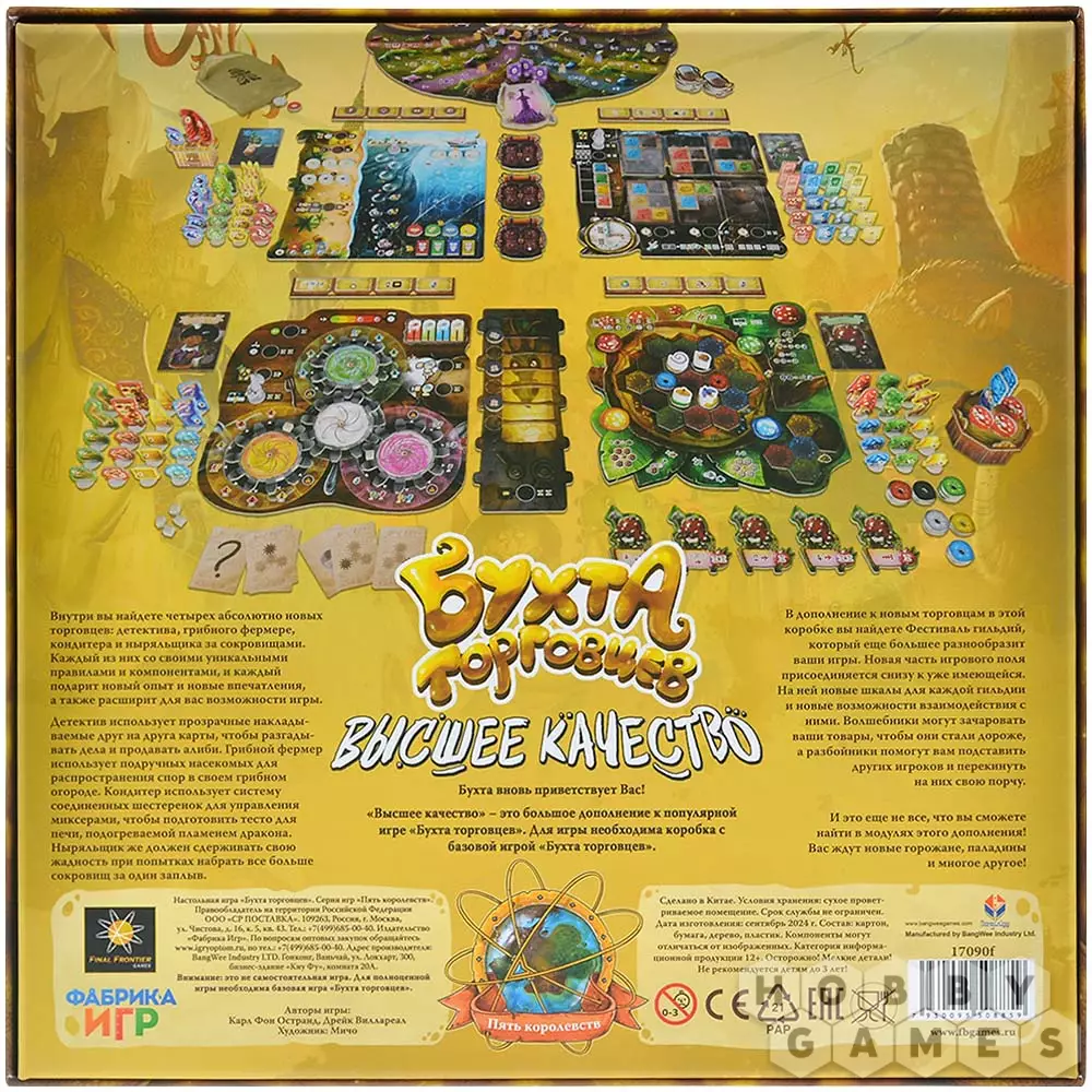 Победитель в "Бухта торговцев: Высшее качество" определяется, как и в базовой игре – по наибольшему количеству монет. Новые торговцы и гильдии предоставляют дополнительные способы заработать, но баланс между риском и выгодой остаётся ключевым. Яркие компоненты делают игру ещё эффектнее, а вариативность гарантирует, что каждая партия будет непохожей на предыдущую. Идеально для тех, кто хочет углубить тактику и удивить соперников неожиданными ходами!