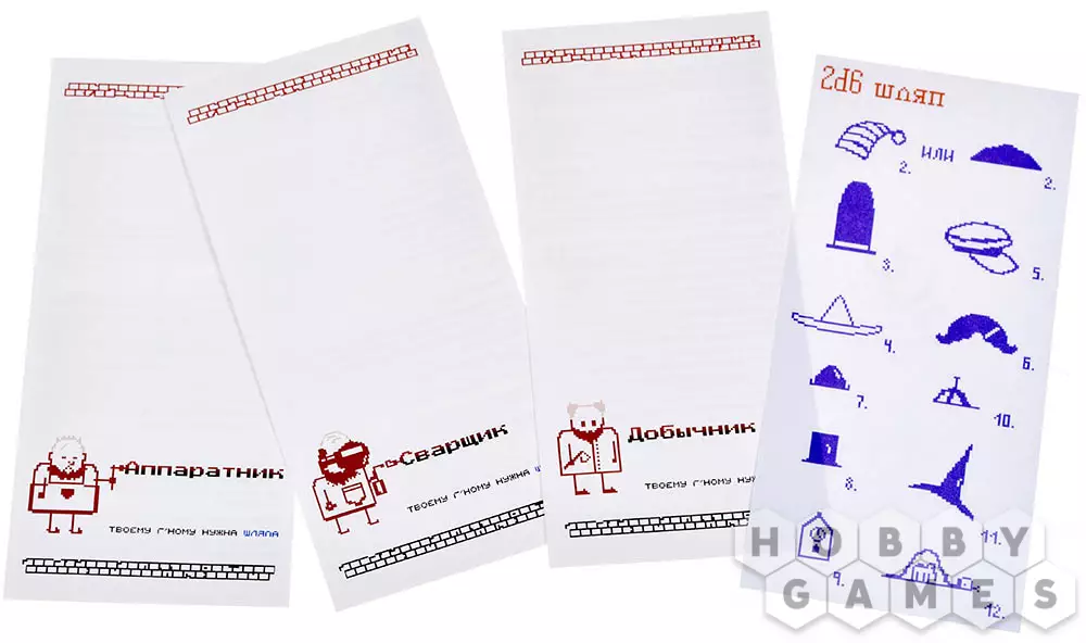 Набор раздаточных материалов для игры включает три буклета-персонажей, а именно "аппаратника", "добытчика" и "сварщика", а также стикеры с самыми модными гномскими шляпами. Выбирайте любую, лишь бы она была синего цвета!