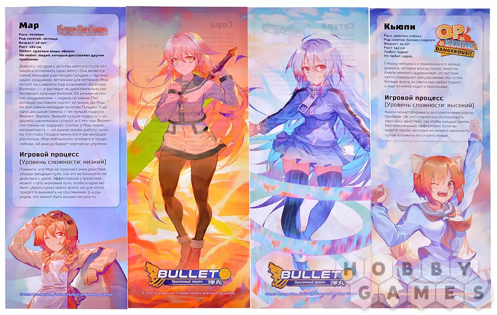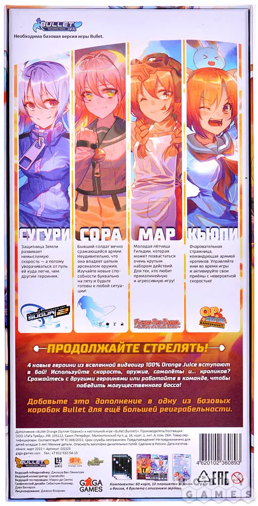 Bullet: Orange добавляет к базовой версии игры ещё четырёх героинь, которые были перенесены из видеоигры 100% Orange Juice. Механически ничего не поменялось: это всё та же безумная игра в стиле компьютерных шутеров и аниме. Но вот разнообразия прибавилось! Новые героини готовы ворваться в самый эпицентр чумовой перестрелке и показать приевшимся участникам новые навыки!