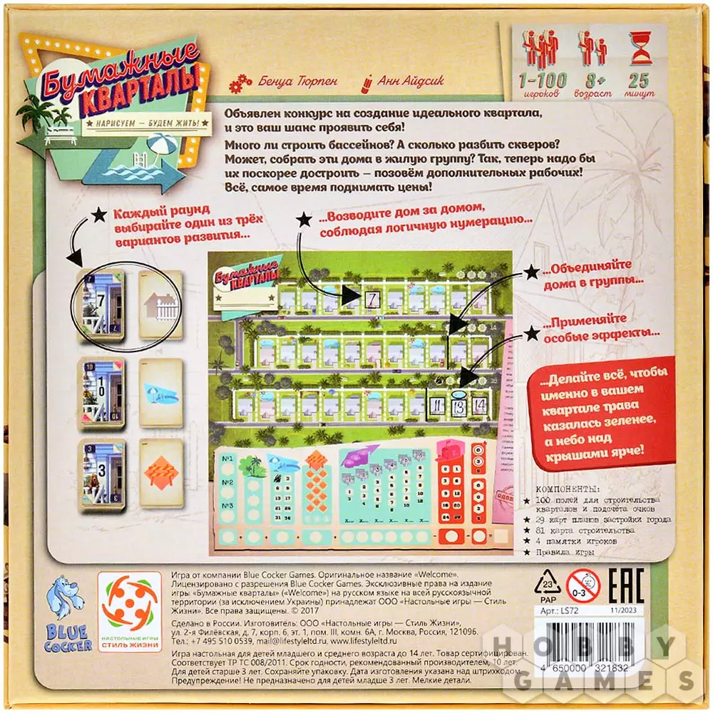 Примите участие в конкурсе на лучший жилой район! В игре "Бумажные кварталы" Вам предстоит стать планировщиком архитектурного бюро. Застраивайте улицы, обозначая номерами в соответствии с планом застройки, где и какой будет стоять дом. Таким образом Вы отметите целые жилые кварталы, которые в конце игры наградят Вас победными очками, но только если застроить их полностью. Есть и другие способы заработать победные очки. Можно улучшить качество жизни обитателей района, построив там парки, бассейны и другие рекреационные места. С помощью агентов по недвижимости можно поднимать уровень престижа Ваших районов. Но самое главное в игре – вовремя сдать готовые дома жителям.