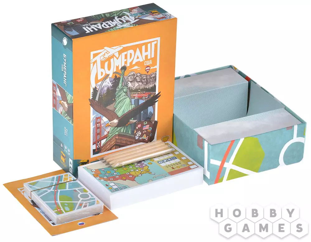 В настольной игре "Бумеранг: США" вам предстоит отправиться в Америку! Посетите каждый штат, полюбуйтесь местными достопримечательностями, посетите различные мероприятия и запечатлейте свои приключения!