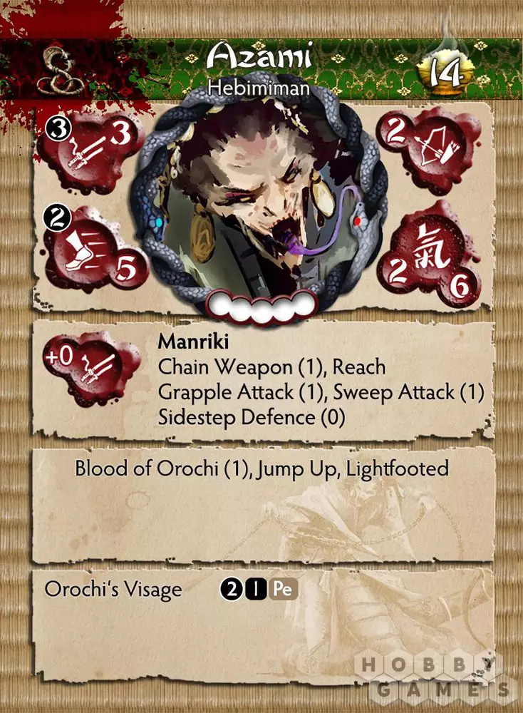 Azami – отличная модель, которую можно смело посылать против врагов лучших воинов, поскольку она сводит на нет их парирование. Даже самый храбрый самурай может не справиться с испытанием на Страх (6) из-за её черты Terror. Это позволяет Azami отбиваться от врагов, нанося серьёзные удары в ближнем бою, в то время как вторая модель приближается, чтобы прикончить врага. Кроме того, у неё есть черта Lightfooted и Jump Up, что гарантирует, что она всегда сможет добраться до своей цели. Azami – идеальное дополнение к стартовому набору клана Ito и соответствует тематике Serpents Coil в качестве боевой модели.