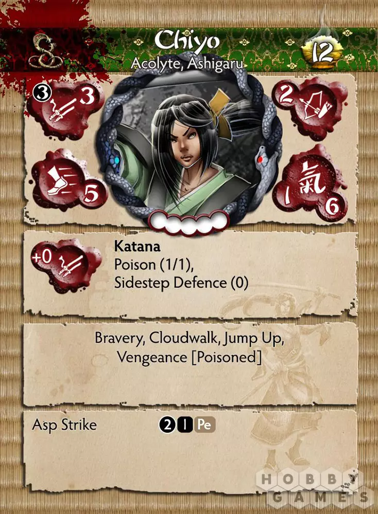 Chiyo выделялась среди других Temple Bushi: она быстро овладела искусством Asp Strike, а присутствие духа и решимость вернуться в бой, когда та сбита с ног, были отмечены её предводителями.