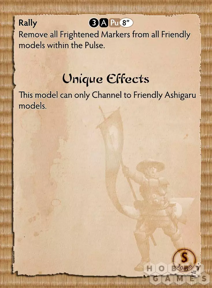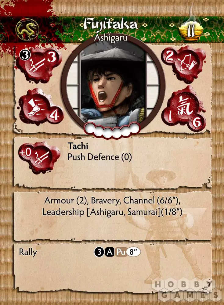 Когда ход битвы меняется и воля солдат префектуры ослабевает, Fujitaka размахивает своим знаменем и сплачивает войска. Его храбрость перед лицом невероятной опасности хорошо известна, и собратья Ashigaru обретают в его присутствии свою внутреннюю силу. Fujitaka также делится своей силой, чтобы дать возможность другим продолжать добрую борьбу.