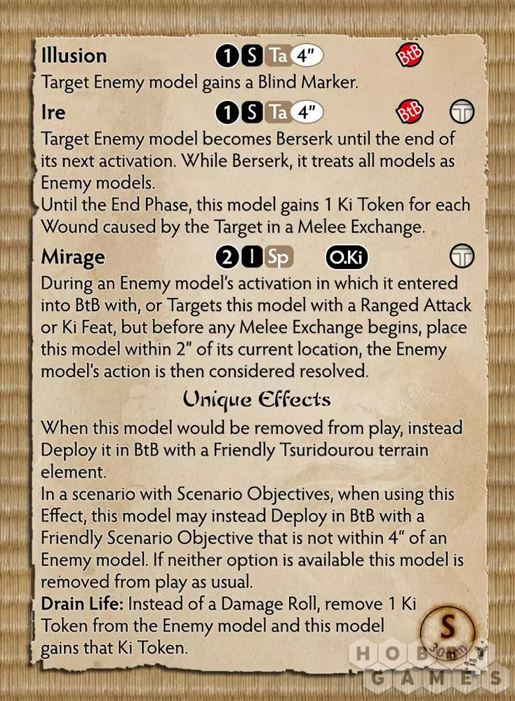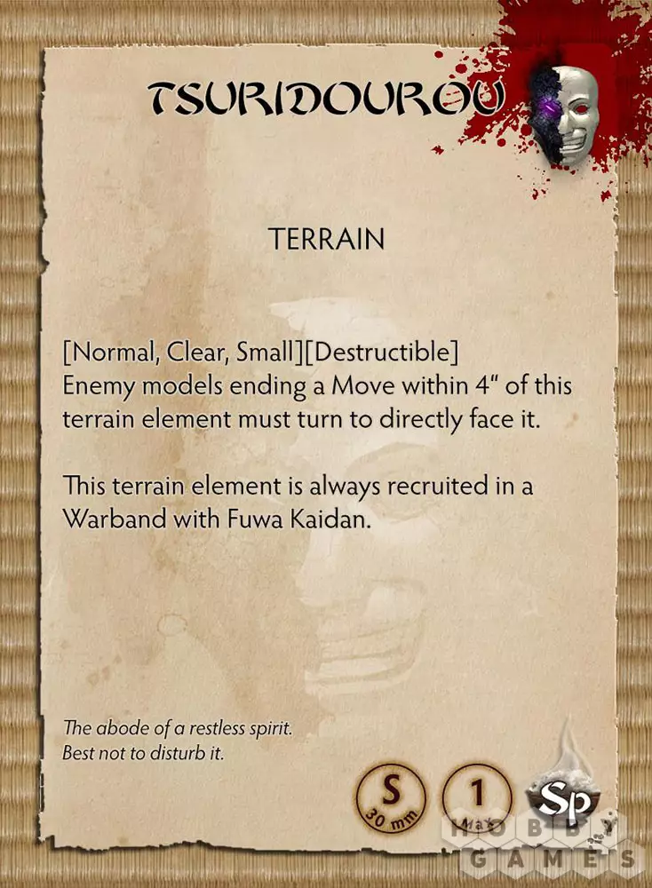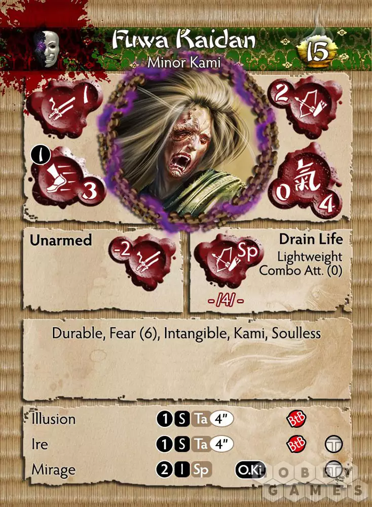 На столе у Fuwa Kaidan есть множество способов нарушить планы противника и помочь вашим моделям. Слепота (Blind) – это еще одно состояние, которое можно добавить в свой арсенал, и, поскольку для этого не требуется противопоставлять Ki, его можно легко применить. Ярость (Ire) – очень мощная способность, но использовать её можно лишь когда дух стоит близко к врагу. У Fuwa Kaidan практически не будет защиты, если противник сможет преодолеть её иллюзии, поэтому она может быть убрана с поля вашим противником. Однако на этом всё не кончается, поскольку дух может вернуться, пока её Tsuridourou всё ещё в игре.