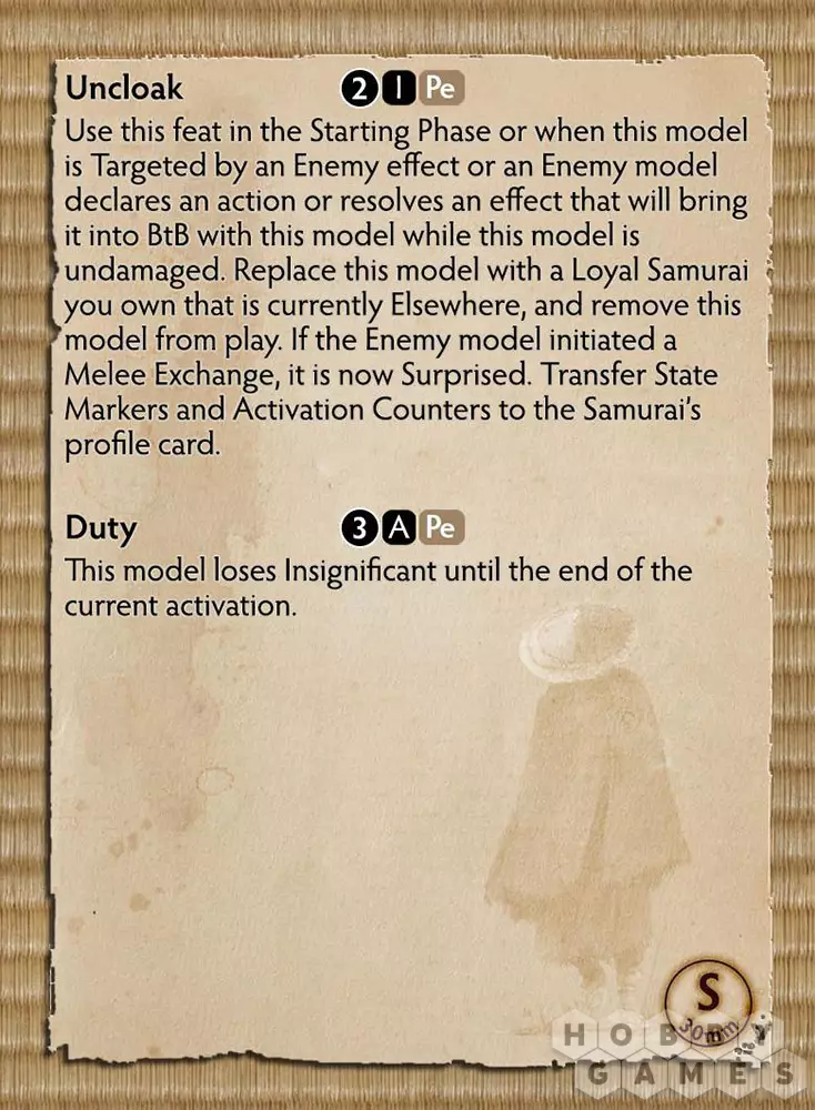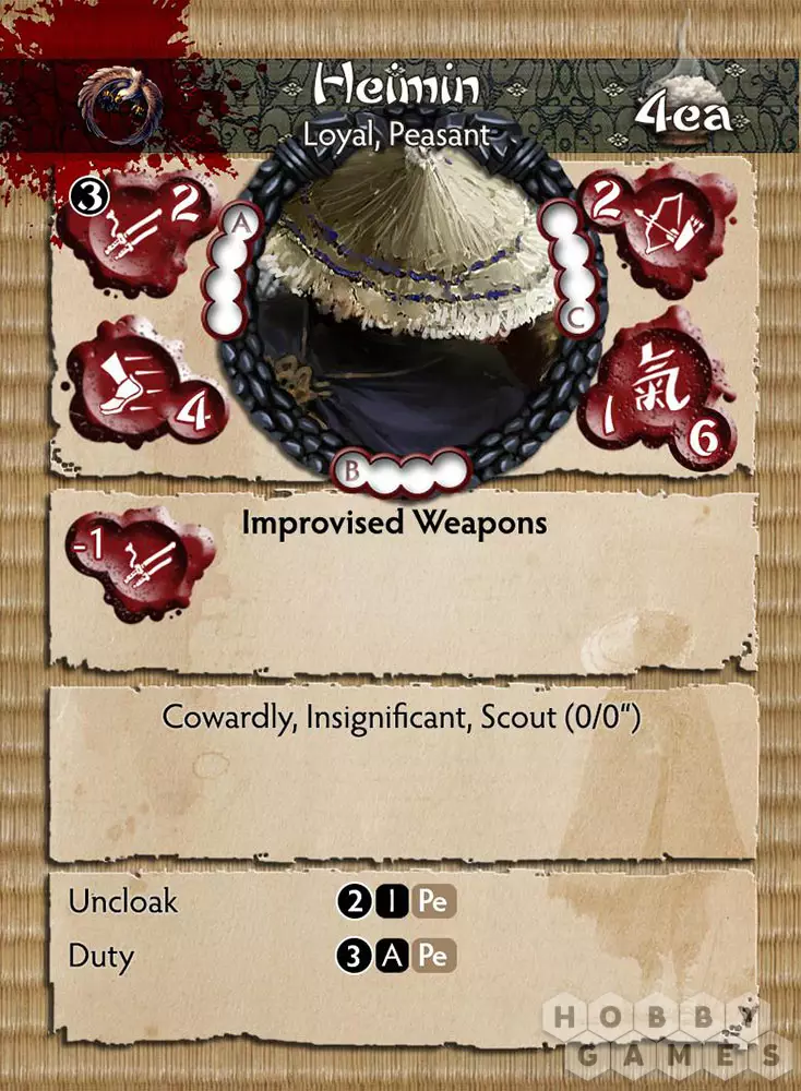 Таким образом, выставляя троих из них, противники вынуждены играть так, как будто все они самураи, пока те не раскроются. И вы можете решить во время игры, кто из них самураи (если таковые будут), а кто безобидные крестьяне. В сочетании с навыком самураев Shiho – Flank trait – это мощный способ контролировать, где будет происходить сражение.