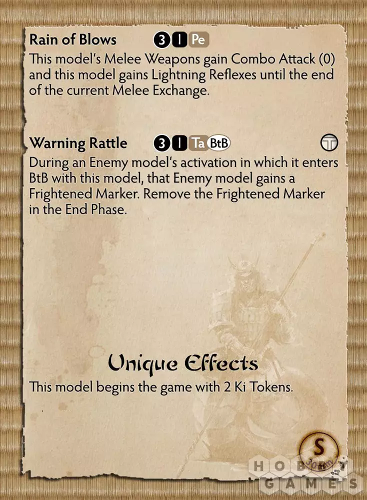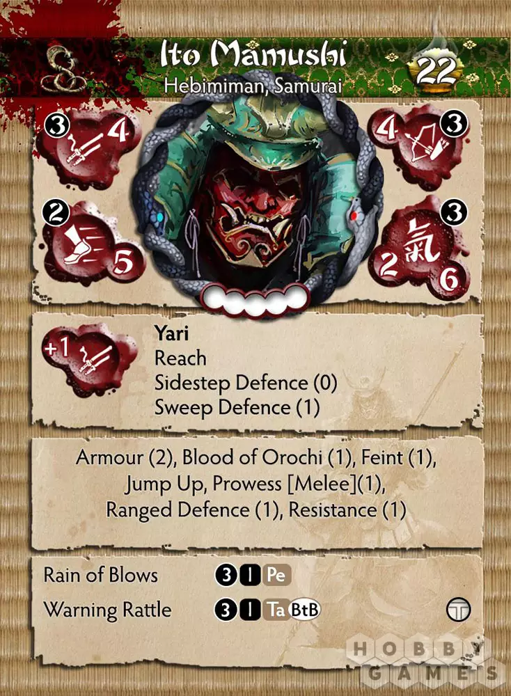 Mamushi предлагает игрокам Ito нового самурая, особенно желанного в тематике Благословенных (The Blessed theme). Способность автоматически накладывать маркеры страха (Frightened) даёт лёгкий доступ к новому дебаффу, а его навыки ближнего боя (4) и манёвр (1) делают его отличным бойцом. Он самодостаточен, начиная с 2 дополнительных жетонов Ki, поэтому ему практически не нужна поддержка, чтобы удержать позиции.