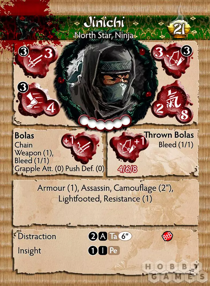 Jinichi – ценный боец North Star, который привносит несколько иной подход в то, на чём специализируются эта организация. Он в совершенстве овладел замысловатым оружием, представляющим собой уникальную комбинацию клинка и цепи. Жужжащий звук, издаваемый им при вращении, часто является последним, что слышат враги Jinichi перед смертью. Такое оружие может достаточно быстро оказаться между самураем и его мечом, тем самым пробивая брешь в его защите и оставляя его открытым для атаки. Лезвия предназначены для того, чтобы резать и отрывать плоть от костей, в то время как цепь может обездвижить руки или ноги неосторожного противника. Jinichi также не понаслышке знаком с запасами смертоносных ядов своего клана, ими он и смазывает свои клинки. Jinichi – смертоносная машина для убийств, склонная к тактике и террору.