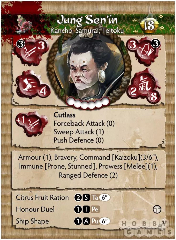 Sen’in застала эпоху, когда клан Jung оставался верным самурайским родом и официальным флотом Jwar Isles. Многолетняя преданная служба принесла ей высокий ранг коммодора. На своём корабле она поддерживает строжайшую дисциплину, не терпя обычного пиратского сброда с других судов. В плавание она отправляется с отрядом высокопрофессиональной морской пехоты, которая собирается на палубе только при неминуемой угрозе. Всё остальное время они оттачивают мастерство, потребляют пищу и отдыхают в изолированных от основной команды помещениях.