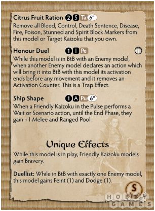 Sen’in обладает способностью мягкого очищения, что всегда ценно при отсутствии на борту Sea Witches. Но подлинный талант она раскрывает в дуэлях один на один. Обладая Feint и Dodge, а также способностью блокировать вмешательство других вражеских моделей в поединок, она не просто уверенно держится в бою – при должном мастерстве её под силу одолеть многих крупных персонажей в игре.