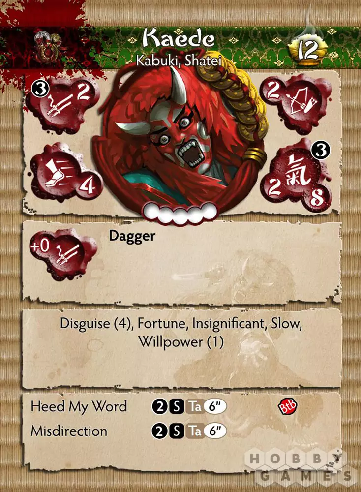 Жизнь для Kaede – всего лишь очередное представление. Он научился своему ремеслу на улицах Jima, где от исполнения роли зависело, будет ли сегодня пуст желудок, цела голова и настанет ли вообще завтрашний день. Kaede относится к бою как к зрелищу, по ходу сражения он работает над тремя актами пьесы, адаптируя свой стиль к каждому акту, чтобы создать безумную концовку, где каждая драматическая смерть ускоряет финал!