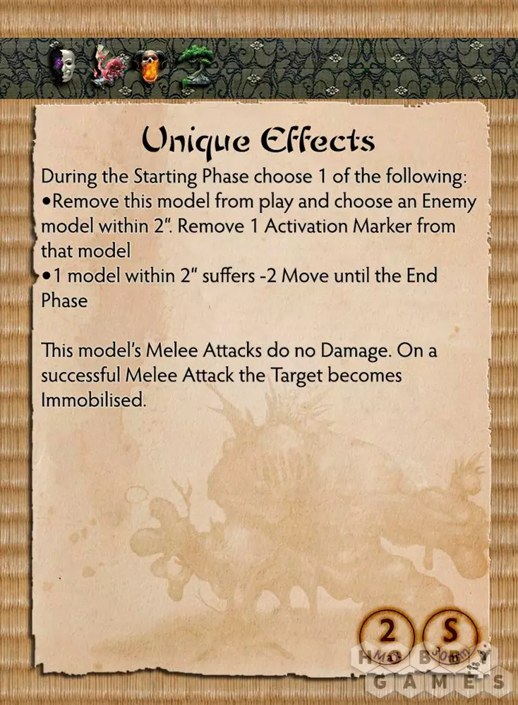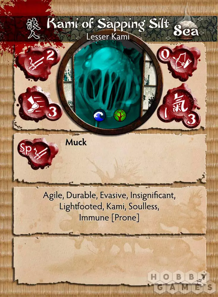 The Kami of Sapping Silt происходит из вод и ила. Методичный и размеренный, он стремится истощить окружающих, изнуряя их. Этот Ками – один из самых злобных духов, притягиваемых к более разрушительным и хаотичным силам, с помощью которых он может достичь удовлетворения, неведомого остальным.