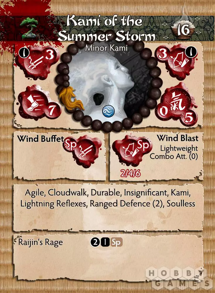 Во время сезона тайфунов на островах сильные ветры уничтожают всё на своем пути. Целые деревни и флотилии исчезают, когда бури бушуют на суше и на море. Штормы черпают свою силу и ярость из океана, постепенно стихая, но даже то короткое время, за которое они достигают суши, вызывает ужас и отчаяние. Подобно шторму, который и олицетворяет этот Kami, время его будет недолгим. Храмовые анимисты обычно призывают этого Kami, чтобы научить послушников путям воздуха, но он также может быть использован из-за своей разрушительной природы против атакующих врагов. Рассеивая вражеские отряды на все четыре стороны, этот дух расстраивает любую хорошо организованную атаку или засаду.