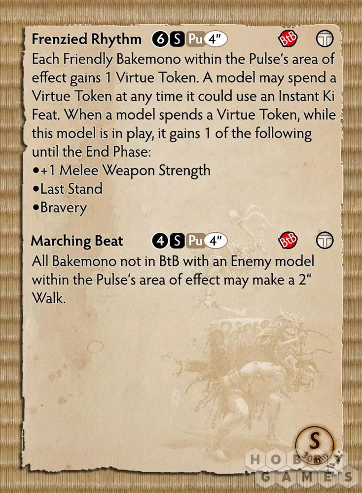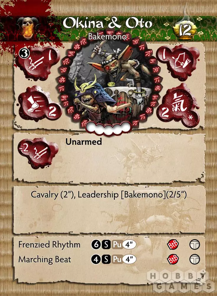 Эта злорадная и ленивая парочка привязала боевой барабан к спине раба. Они отправляются в бой, желая выжать максимум из своих товарищей, и ритмичный бой барабана заставляет Bakemono полностью раскрыть свой потенциал.