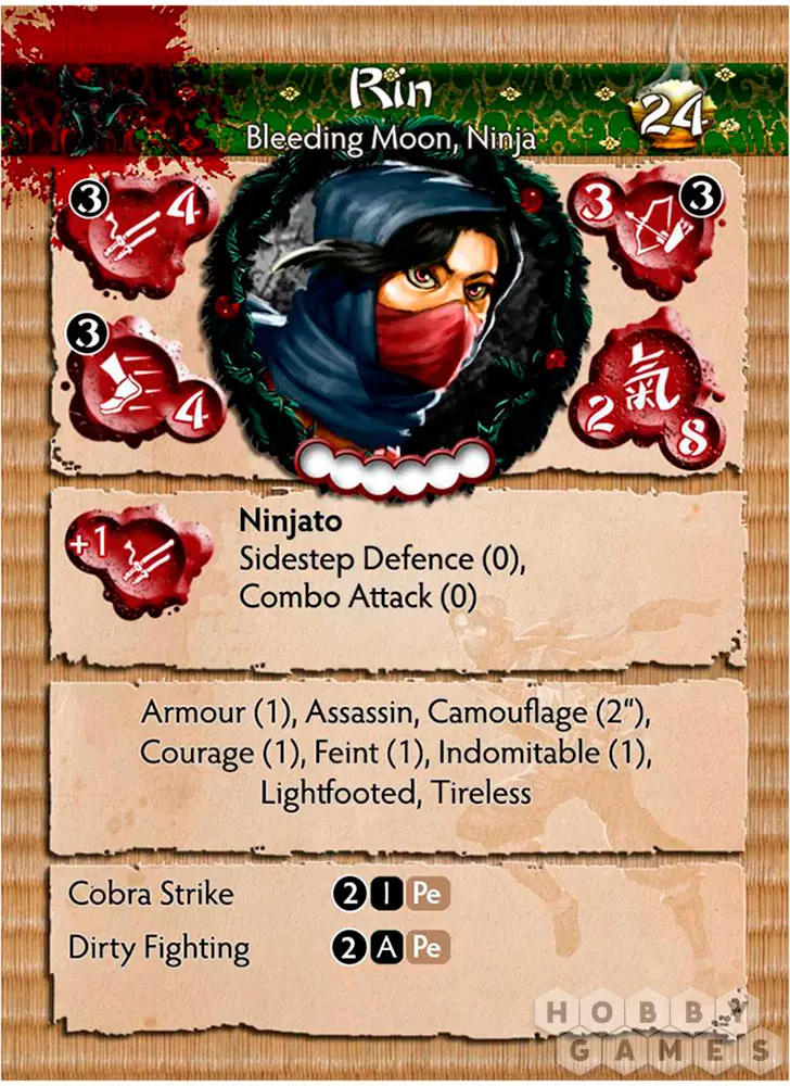 Rin столь же быстра, сколь и смертоносна. Её способность сочетать скорость, оставаясь тихой, как мышка, со свирепыми боевыми навыками делает её настоящим достоянием клана. Её катаны сверкают яростью ее Дома и оставляют за собой множество трупов. С её жаждой битвы может сравниться только решимость Katsumi, также из "Кровоточащей Луны" (the Bleeding Moon).