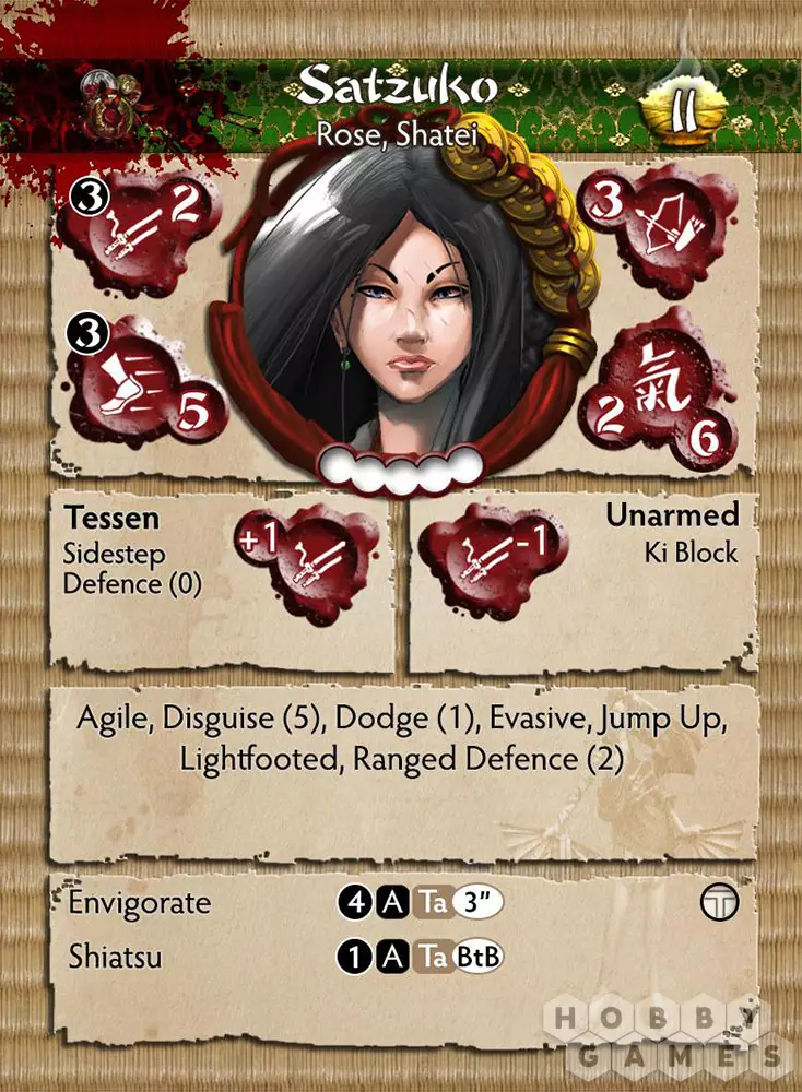 Satzuko специализируется на древнем искусстве массажа и ki-манипуляциях, что является редкостью для женщин в Flower Houses. Традиционно эта роль отводится мужчинам, которые используют свою силу, чтобы снять стресс и напряженность с тела клиента, но Satzuko не менее искусна и более чем способна успокоить заблокированные чакры, позволяя Ki течь правильно.