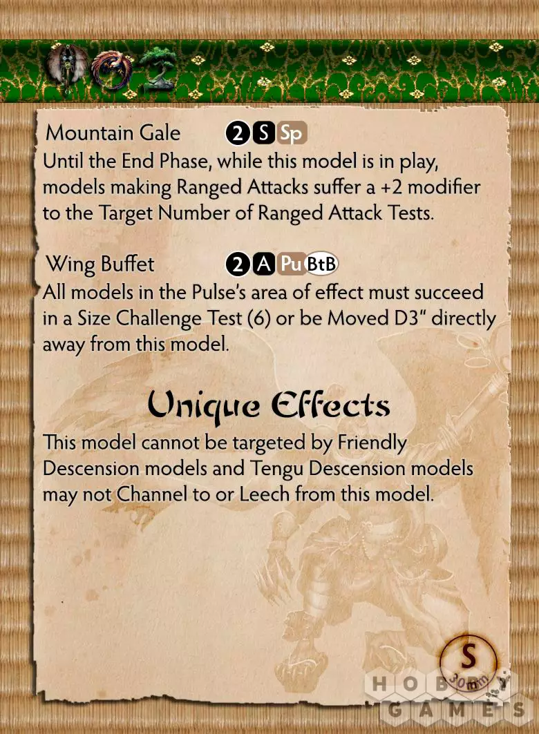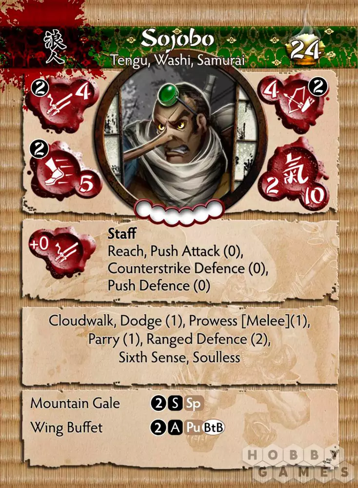 О боевых искусствах Tengu ходят легенды по всей Golden Empire. Хотя эти ёкаи-птицы немногочисленны, их долгая жизнь дает им достаточно времени, чтобы овладеть не только боевыми искусствами, но и узнать секреты ками, которые называют горы своим домом. Скрытые в высокогорных городах и охраняемые преданными племенами, эти таинственные воины редко предстают чьему-либо взору. Что заставило Sojobo спуститься с гор и прийти на помощь старым союзникам Tengu – the Temple – неизвестно. С боевыми навыками Sojobo могут сравниться очень немногие. Теперь, когда он расправил огромные крылья и покинул свой горный дом, дух народа Rokan воспрял, а перспективы стали более ясными.