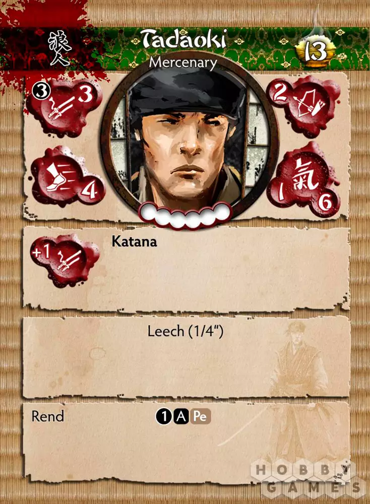 Обладая новой механикой Mercenary, Tadaoki является отличным дополнением к любому боевому отряду, который может себе это позволить, а Iaijutsu – прекрасным средством защиты от всевозможных вражеских угроз. Если вы "немного доплатите ему", используя его Leech Trait, он обретёт храбрость, которая неоценима в бою.