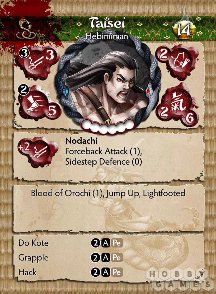 Глубоко в холодных, влажных храмах Orochi, где таятся самые страшные кошмары, Taisei ждёт, сберегая энергию только для того, чтобы исполнить волю единственного истинного Ками. Мастерство делает его выдающимся представителем Hebi. Огромная сила позволяет ему владеть нодати с пугающей ловкостью и мощью, а кольца тяжёлого хвоста могут сокрушать врагов, оставляя их молить о пощаде того, кто никогда её не знал…