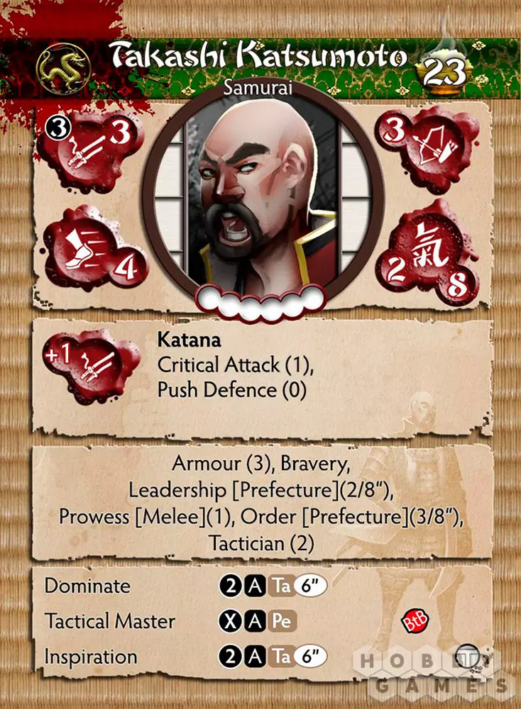 Сэнсэй школы Koryu в Ryu, Katsumoto, на протяжении многих лет передавал свои исключительные тактические навыки сыновьям клана Takashi. Общепризнано, что во многом военный успех в Dragon wars был достигнут благодаря находчивости Katsumoto. Его становление проходило в Западных землях (the lands of the West), где обучаясь в отдалённых школах, он неустанно изучал местную военную тактику, всегда стремясь к знаниям. На поле боя Katsumoto – олицетворение спокойствия, каждый его шаг продуман, а каждый приказ – взвешен. Те, кто сталкивался лицом к лицу со старым боевым конём, знают, что победа не даётся легко, когда твой противник – Takashi Katsumoto.