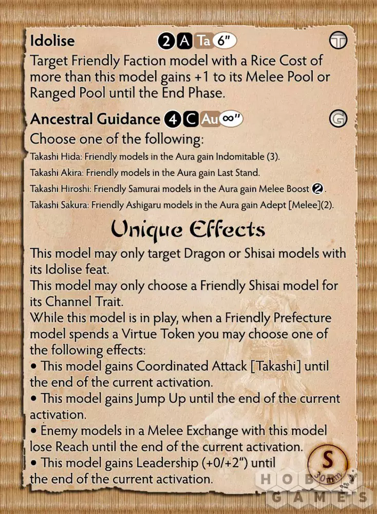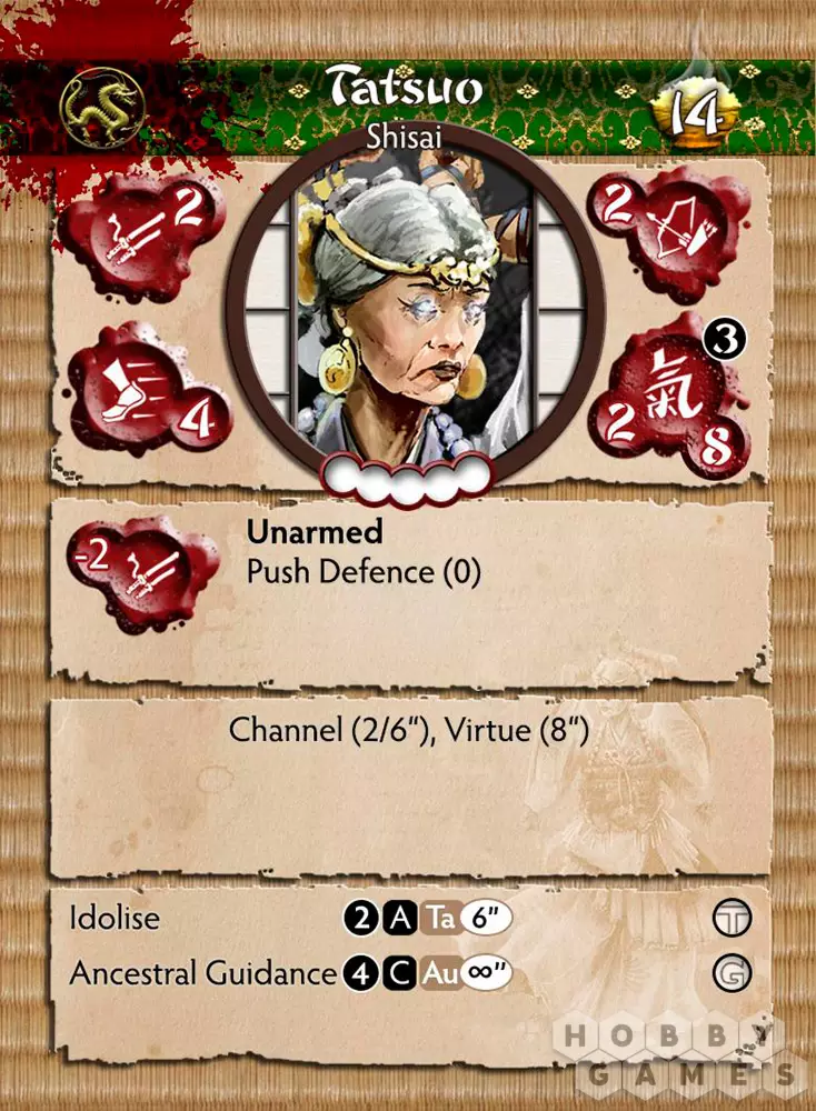 У Tatsuo огромный потенциал, который легко раскрывается в бою. Idolise – замечательный навык, но и Ancestral Guidance Ki Feat обязательно найдёт применение, поскольку его мощные эффекты могут изменить ход игры. Вдобавок ко всему, благодаря возможности предоставлять Virtue Token и добавлять Virtue Effects, она представляет собой модель с множеством преимуществ, которые можно предоставить нужной модели в нужное время.