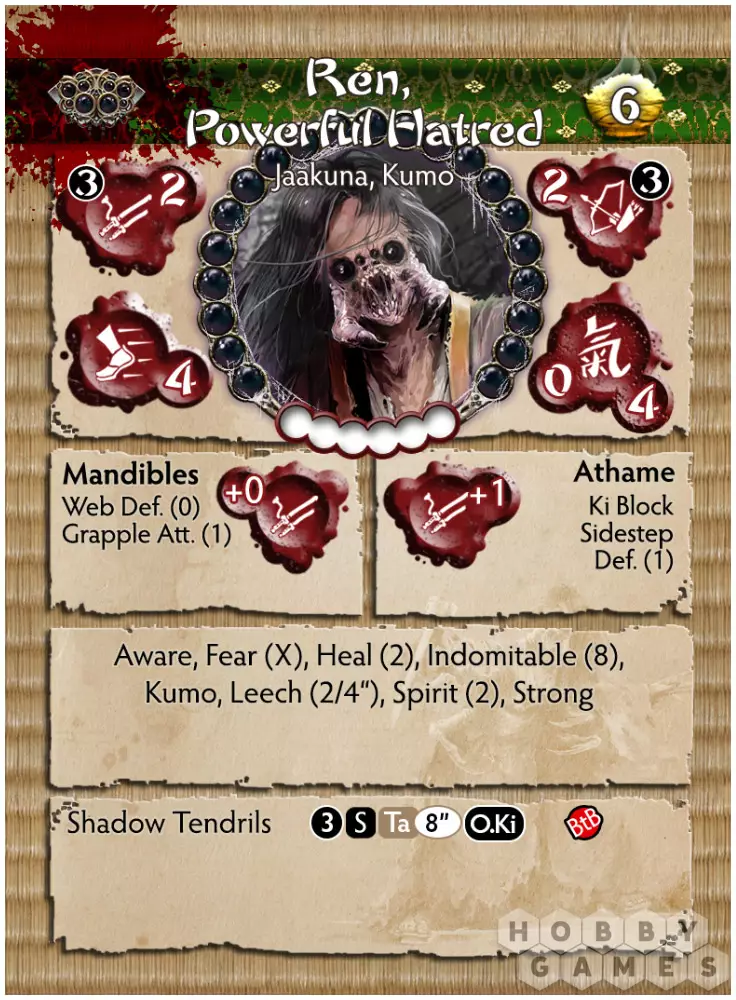Знания, полученные Ren в прошлой жизни, наделили её способностью исцелять, что может быть полезно, поскольку во фракции есть множество моделей с большим запасом ран, но с небольшим количеством видов защиты. Она может высасывать энергию из слабых, жалких мужчин, получая Ki легче, чем другие Jaakuna. Хотя она и не подходит для ближнего боя, её способность блокировать Ki может найти интересное применение. А Shadow Tendrils Ki Feat, хорошо известное игрокам Savage Wave, отличается от других и добавляет мощные возможности. Однако, лучшим качеством этой модели является её стоимость, которая составляет всего 6 Rice.