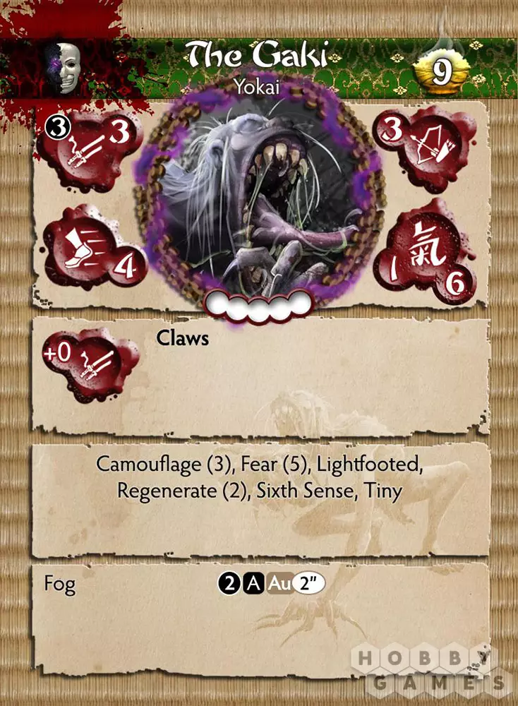 The Gaki – это некогда жадные и тщеславные люди, проклятые за свои пороки и обречённые скрываться в темноте. Их постоянно преследует мучительный голод, который невозможно утолить, сколько бы мяса ни поглощал этот мерзкий ёкай. Те редкие крестьяне, которые выживают под стальными когтями и острыми, как бритва, зубами, рассказывают о плотном, холодном тумане, окутывающем их перед атакой.