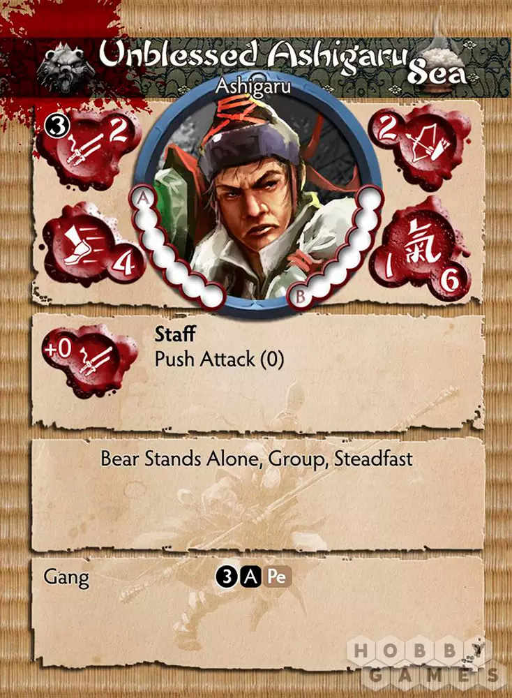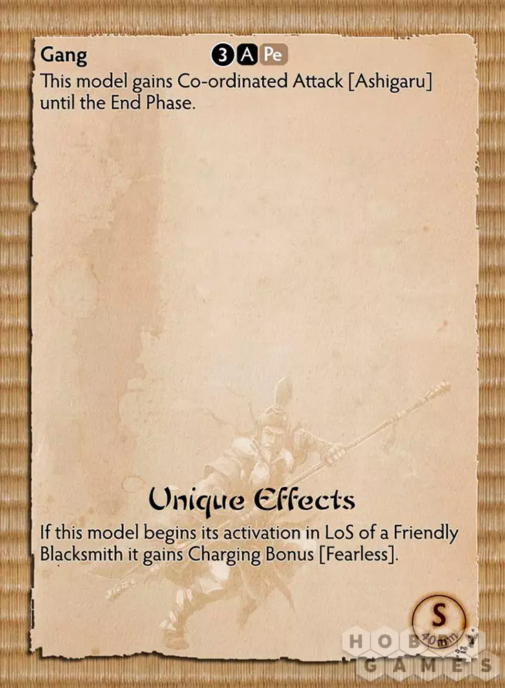 Каждому отряду нужна надёжная опора, способная достойно принять удар и встретить противника. Ashigaru – это как раз такие бойцы. Держась плечом к плечу, они составляют большую опасность для противника. Кроме того, они уверены в своём оружии. Если в поле зрения у них будет кузнец, они получат Charging Bonus Fearless.