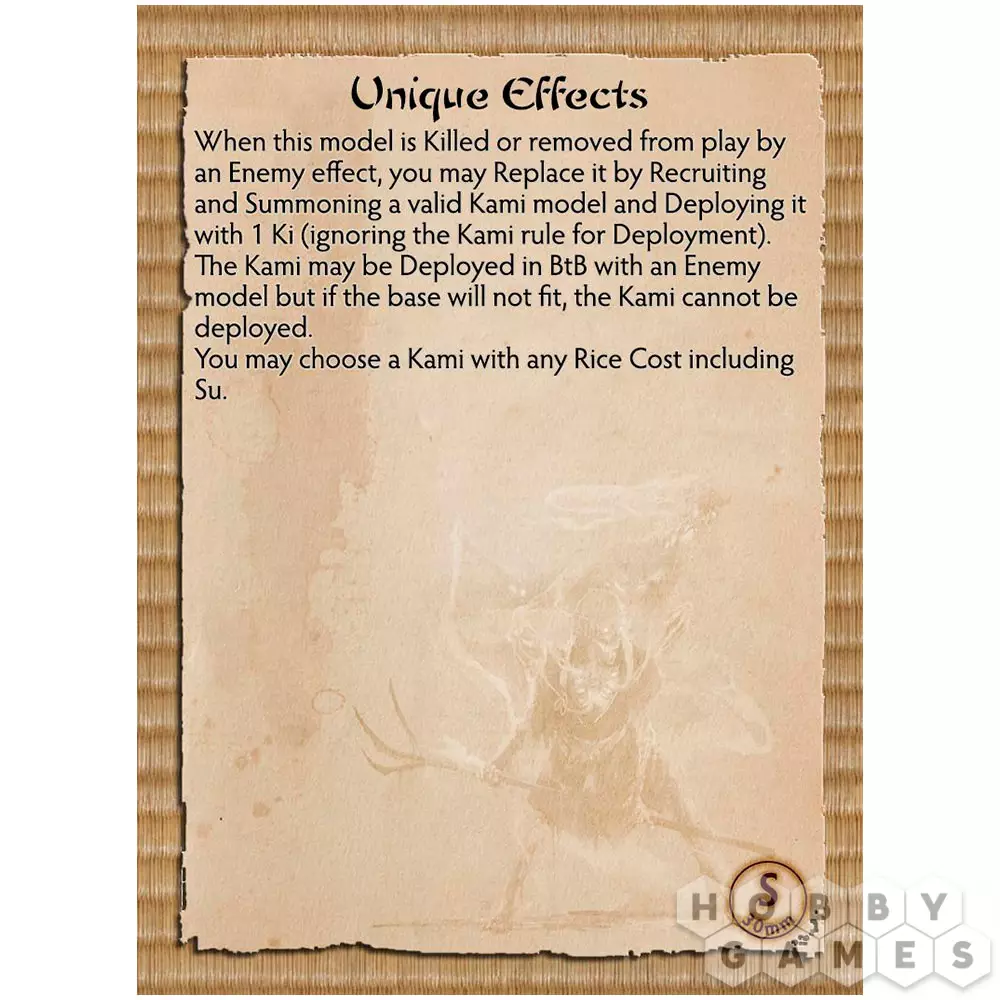 Как только его скелетное тело разрушится, дух внутри освободится, и вы сможете заменить его любым подходящим ками, таким как Wrath, Envy или Pride, которые обычно связаны с сиротами, но не в этот раз... Вы даже можете выбрать Choking Fog, Blighted Earth или других ками, которых Cult of Yurie привлекает для своих тёмных дел. Этот выбор даст вам возможность призвать нужного ками в критический момент. Как игрок, вы также можете заменить Warui на легендарного Wraith, одного из самых устрашающих существ в игре.