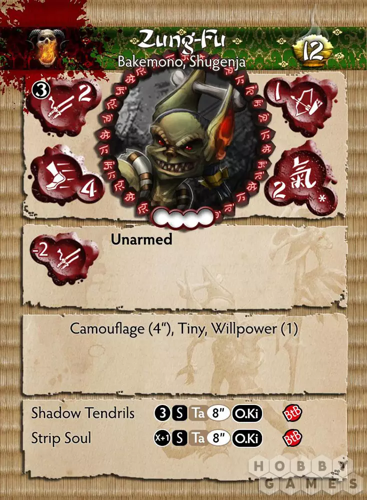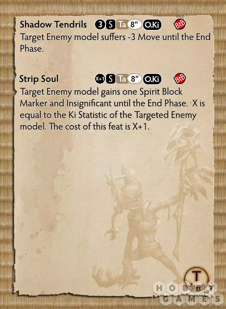 Shugenja племён Bakemono так долго жили во мраке, что, кажется, теперь воспринимают его почти как живое существо. Они шепчутся с самой тьмой, прислушиваются к ней и учатся у неё. Там, где другие видят пустоту, они видят силу и древнее знание. В бою Shugenja способны использовать бесконечную силу теней, чтобы приковывать врагов к месту и разрубать их на куски, или окутывать саму их душу, скрывая её от света. Те, кто дожил до того, чтобы рассказать эту историю, уже никогда не будут прежними, и многие после этого кажутся потерянными – свет в их глазах гаснет навсегда.